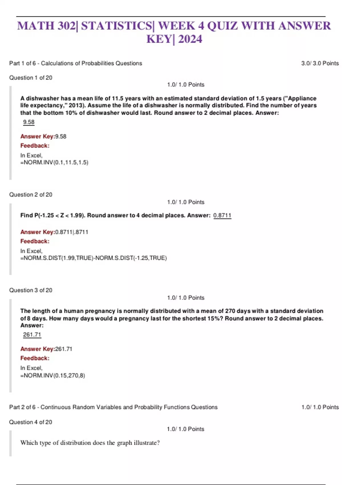 MATH 302| STATISTICS| WEEK 4 QUIZ WITH ANSWER KEY| 2024