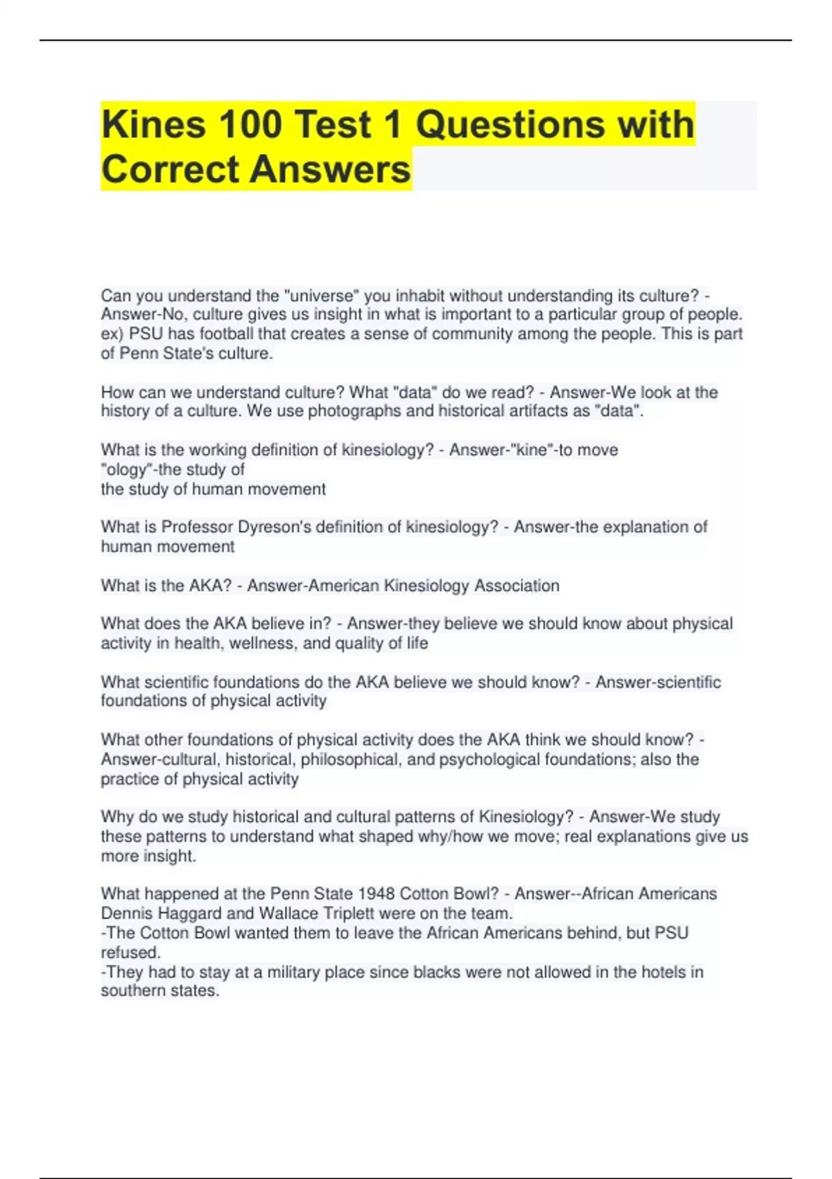 Kines 100 Test 1 Questions with Correct Answers Can you understand the "universe" you inhabit without understanding its culture? - Answer-No, culture gives us insight in what is important to a particular group of people. ex) PSU has football that creates a sense of community among the people. This is part of Penn State's culture. How can we understand culture? What "data" do we read? - Answer-We look at the history of a culture. We use photographs and historical artifacts as "data". What is the working definition of kinesiology? - Answer-"kine"-to move "ology"-the study of the study of human movement What is Professor Dyreson's definition of kinesiology? - Answer-the explanation of human movement What is the AKA? - Answer-American Kinesiology Association What does the AKA believe in? - Answer-they believe we should know about physical activity in health, wellness, and quality of life What scientific foundations do the AKA believe we should know? - Answer-scientific foundations of physical activity What other foundations of physical activity does the AKA think we should know? - Answer-cultural, historical, philosophical, and psychological foundations; also the practice of physical activity Why do we study historical and cultural patterns of Kinesiology? - Answer-We study these patterns to understand what shaped why/how we move; real explanations give us more insight.
