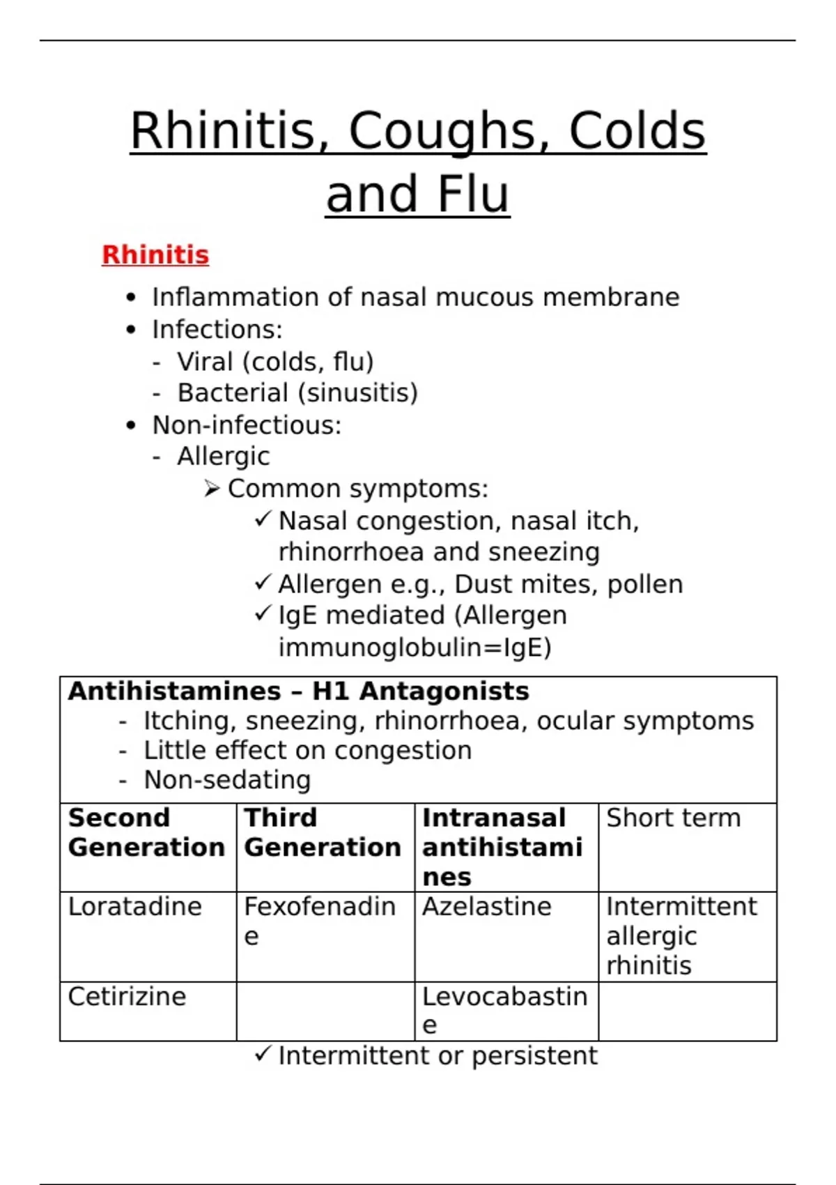 Welcome to the ultimate resource for mastering pharmacology! These notes provide a detailed explanation of Rhinitis, coughs, colds and flus as well as comprehensively categorizing each type of medication.
