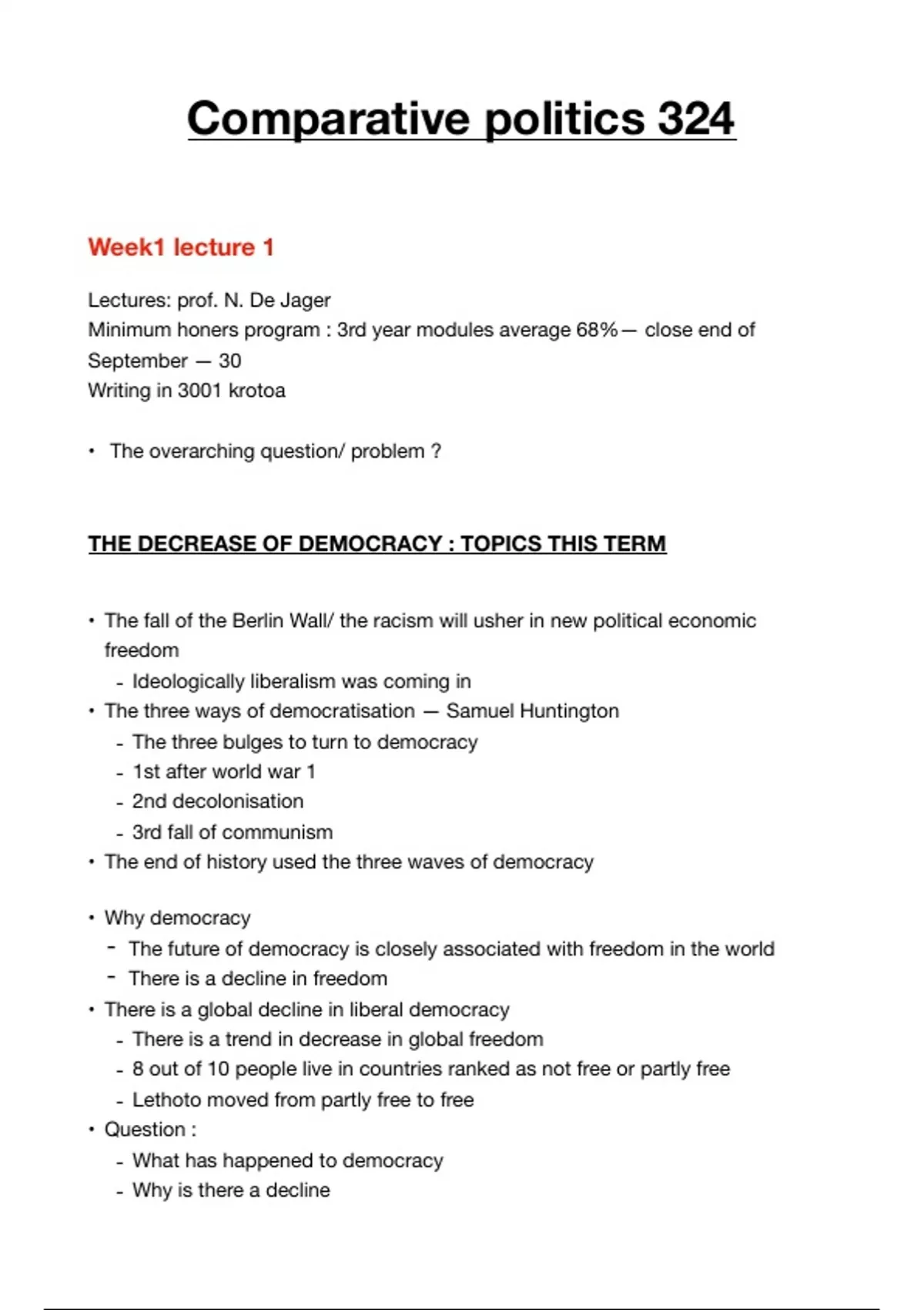 THE DECREASE OF DEMOCRACY : TOPICS THIS TERM