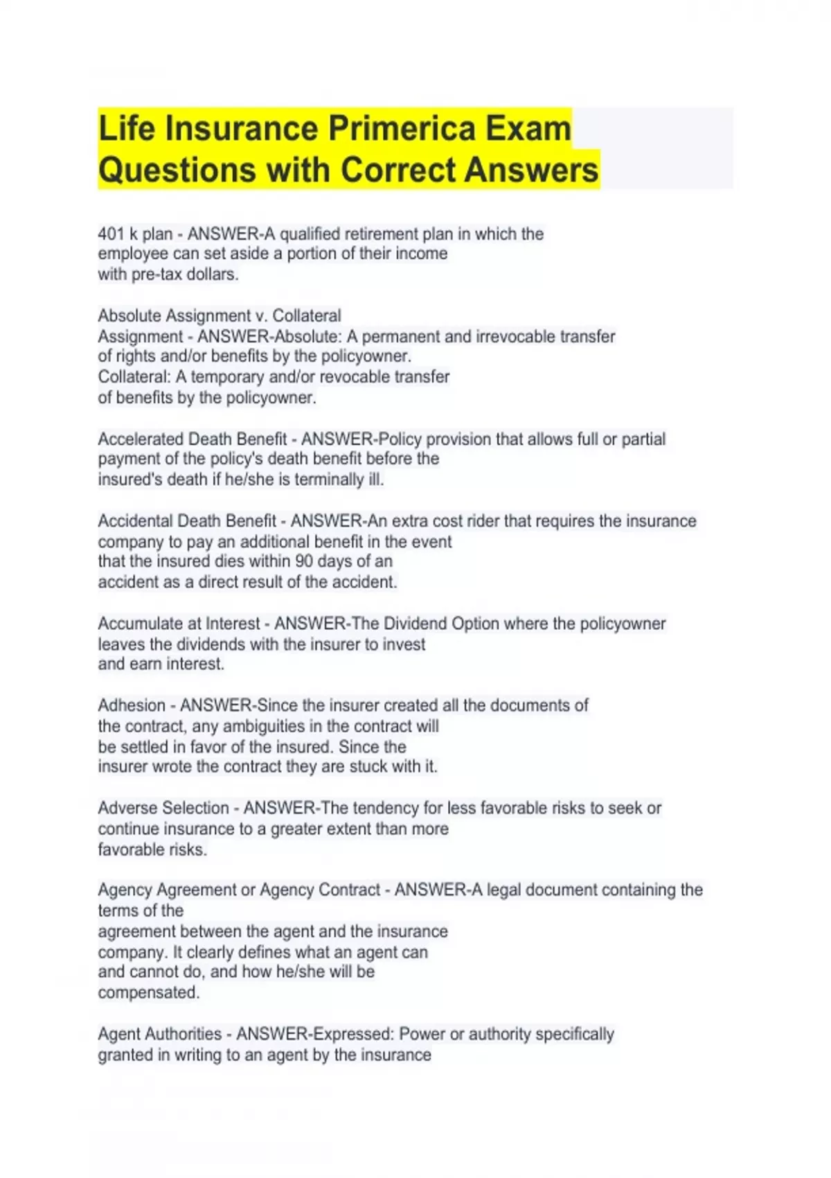 401 k plan - ANSWER-A qualified retirement plan in which the employee can set aside a portion of their income with pre-tax dollars. Absolute Assignment v. Collateral Assignment - ANSWER-Absolute: A permanent and irrevocable transfer of rights and/or benefits by the policyowner. Collateral: A temporary and/or revocable transfer of benefits by the policyowner. Accelerated Death Benefit - ANSWER-Policy provision that allows full or partial payment of the policy's death benefit before the insured's death if he/she is terminally ill. Accidental Death Benefit - ANSWER-An extra cost rider that requires the insurance company to pay an additional benefit in the event that the insured dies within 90 days of an accident as a direct result of the accident. Accumulate at Interest - ANSWER-The Dividend Option where the policyowner leaves the dividends with the insurer to invest and earn interest. Adhesion - ANSWER-Since the insurer created all the documents of the contract, any ambiguities in the contract will be settled in favor of the insured. Since the insurer wrote the contract they are stuck with it. Adverse Selection - ANSWER-The tendency for less favorable risks to seek or continue insurance to a greater extent than more favorable risks. Agency Agreement or Agency Contract - ANSWER-A legal document containing the terms of the agreement between the agent and the insurance company. It clearly defines what an agent can and cannot do, and how he/she will be compensated. Agent Authorities - ANSWER-Expressed: Power or authority specifically granted in writing to an agent by the insurance