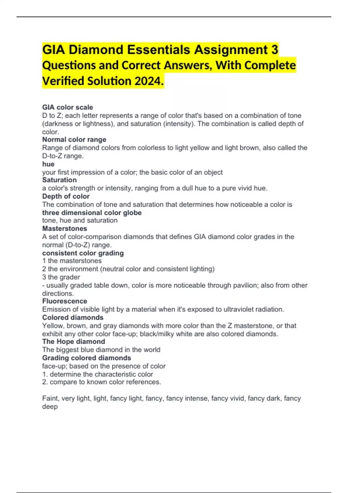 Faint, very light, light, fancy light, fancy, fancy intense, fancy vivid, fancy dark, fancy