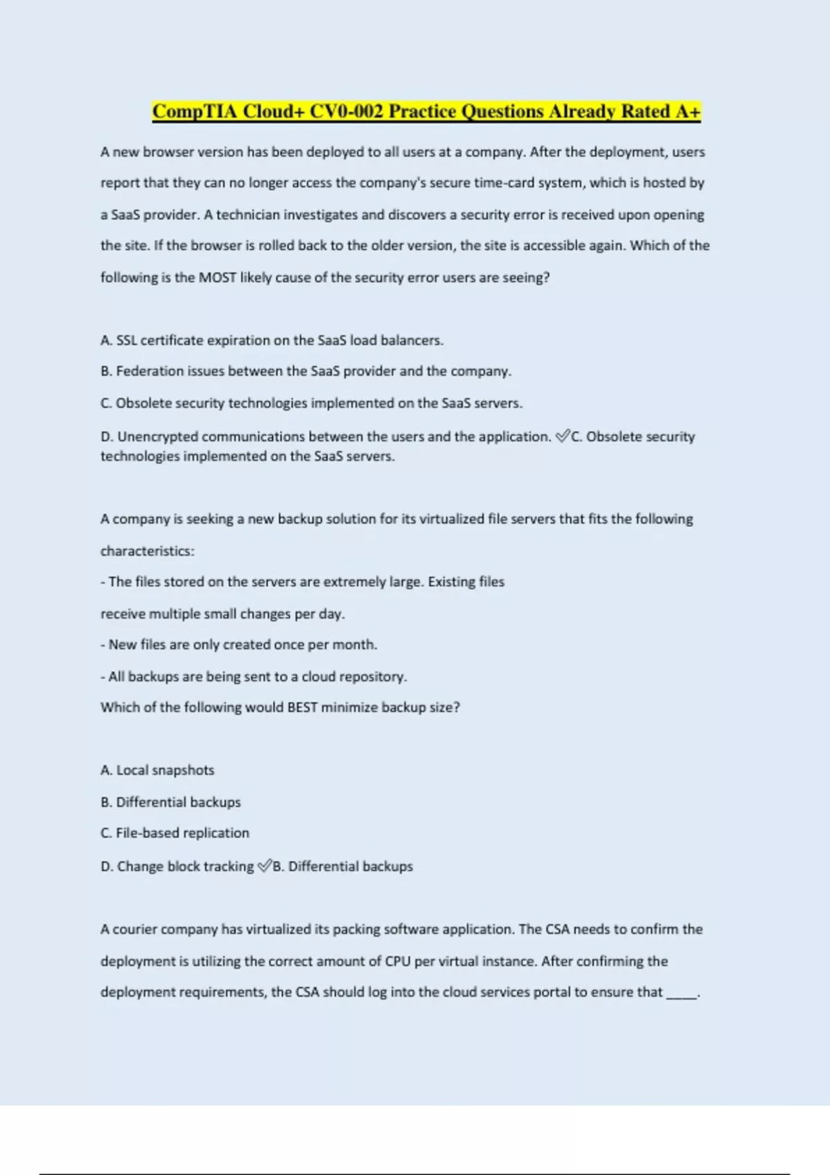 CompTIA Cloud+ CV0-002 Practice Questions Already Rated A+ A new browser version has been deployed to all users at a company. After the deployment, users report that they can no longer access the company's secure time-card system, which is hosted by a SaaS provider. A technician investigates and discovers a security error is received upon opening the site. If the browser is rolled back to the older version, the site is accessible again. Which of the following is the MOST likely cause of the security error users are seeing? A. SSL certificate expiration on the SaaS load balancers. B. Federation issues between the SaaS provider and the company. C. Obsolete security technologies implemented on the SaaS servers. D. Unencrypted communications between the users and the application. C. Obsolete security technologies implemented on the SaaS servers. A company is seeking a new backup solution for its virtualized file servers that fits the following characteristics: - The files stored on the servers are extremely large. Existing files receive multiple small changes per day. - New files are only created once per month. - All backups are being sent to a cloud repository. Which of the following would BEST minimize backup size? A. Local snapshots B. Differential backups C. File-based replication D. Change block tracking B. Differential backups A courier company has virtualized its packing software application. The CSA needs to confirm the deployment is utilizing the correct amount of CPU per virtual instance. After confirming the deployment requirements, the CSA should log into the cloud services portal to ensure that ____. A. the VMs with the most CPU cores available have been selected B. smaller VMs are being selected to reduce the total deployment cost C. the deployment is utilizing the recommended amount of CPUs per VM D. the alarms on CPU utilization have been enabled C. the deployment is utilizing the recommended amount of CPUs per VM A cloud administrator is receiving alerts that the disk on several systems is 90% full. Upon reviewing the systems, the administrator determines that the log directory is using 50% of the disk. The company has a 14-day retention policy for all logs. Which of the following is the BEST solution to implement to minimize future alerts? A. Orchestrate a job to rotate the logs and upload to external storage. B. Delete any log files in the directory that are larger than 20MB. C. Archive the existing logs in the directory and upload to external storage. D. Add additional storage space to the log directory for the servers. A. Orchestrate a job to rotate the logs and upload to external storage. A company purchased a SaaS CRM application. The signed SLA meets year-round performance requirements. Three months after deployment, customers start reporting a slow application response time. System availability, connectivity, and proper functionality still meet the ... Which of the following is MOST likely the reason for the poor response time? A. Incorrect business requirements are invalidating the testing results. B. Bandwidth restrictions are causing poor performance. C. The application version is causing compatibility issues. D. Inadequate documentation is affecting the user interface. C. The application version is causing compatibility issues. A cloud architect created a new delivery controller for a large VM farm to scale up according to organizational needs. The old and new delivery controllers now form a cluster. However, the new delivery controller returns an error when entering the license code. Which of the following is the