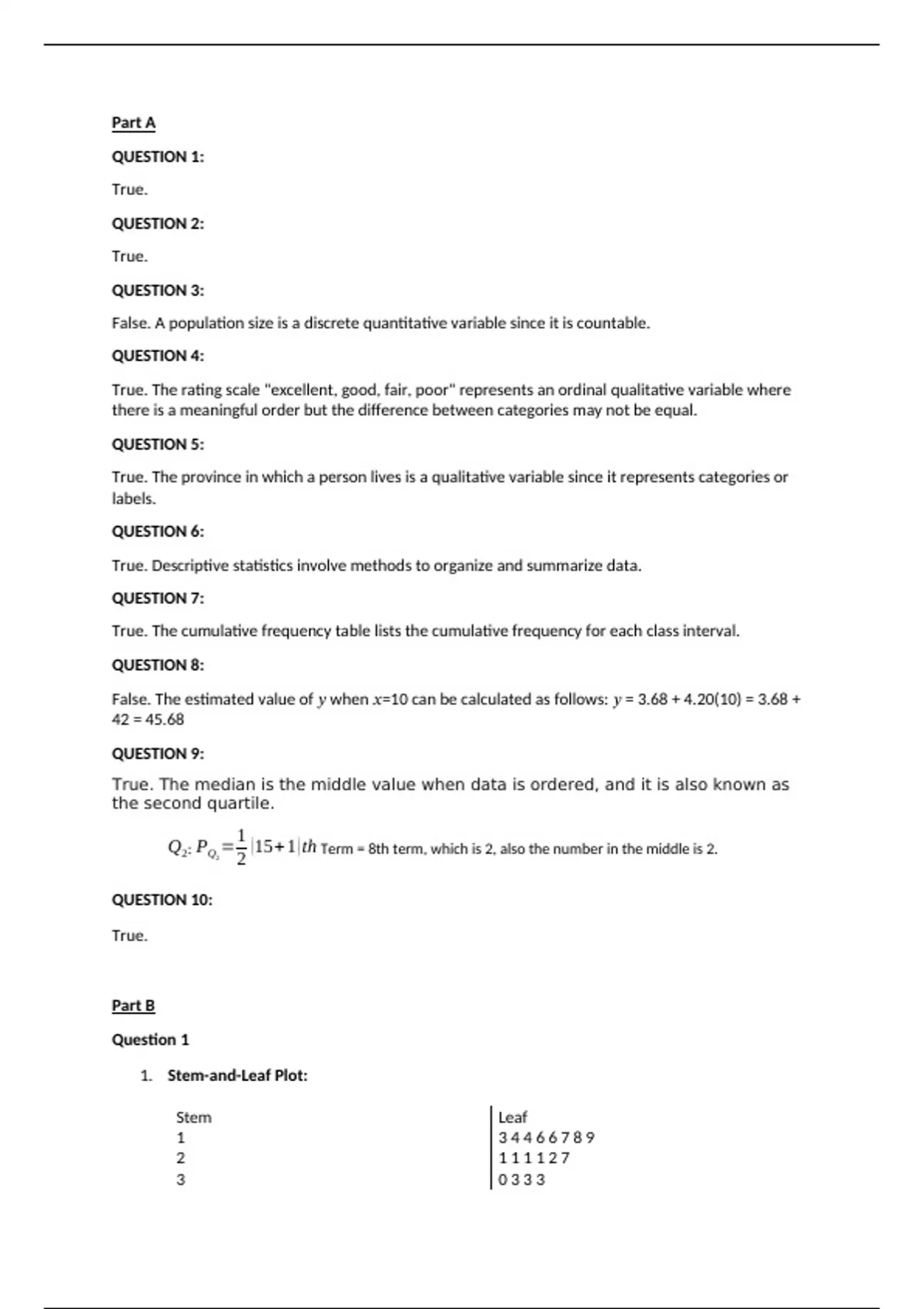 False. The estimated value of 𝑦 when 𝑥=10 can be calculated as follows: 𝑦 = 3.68 + 4.20(10) = 3.68 +