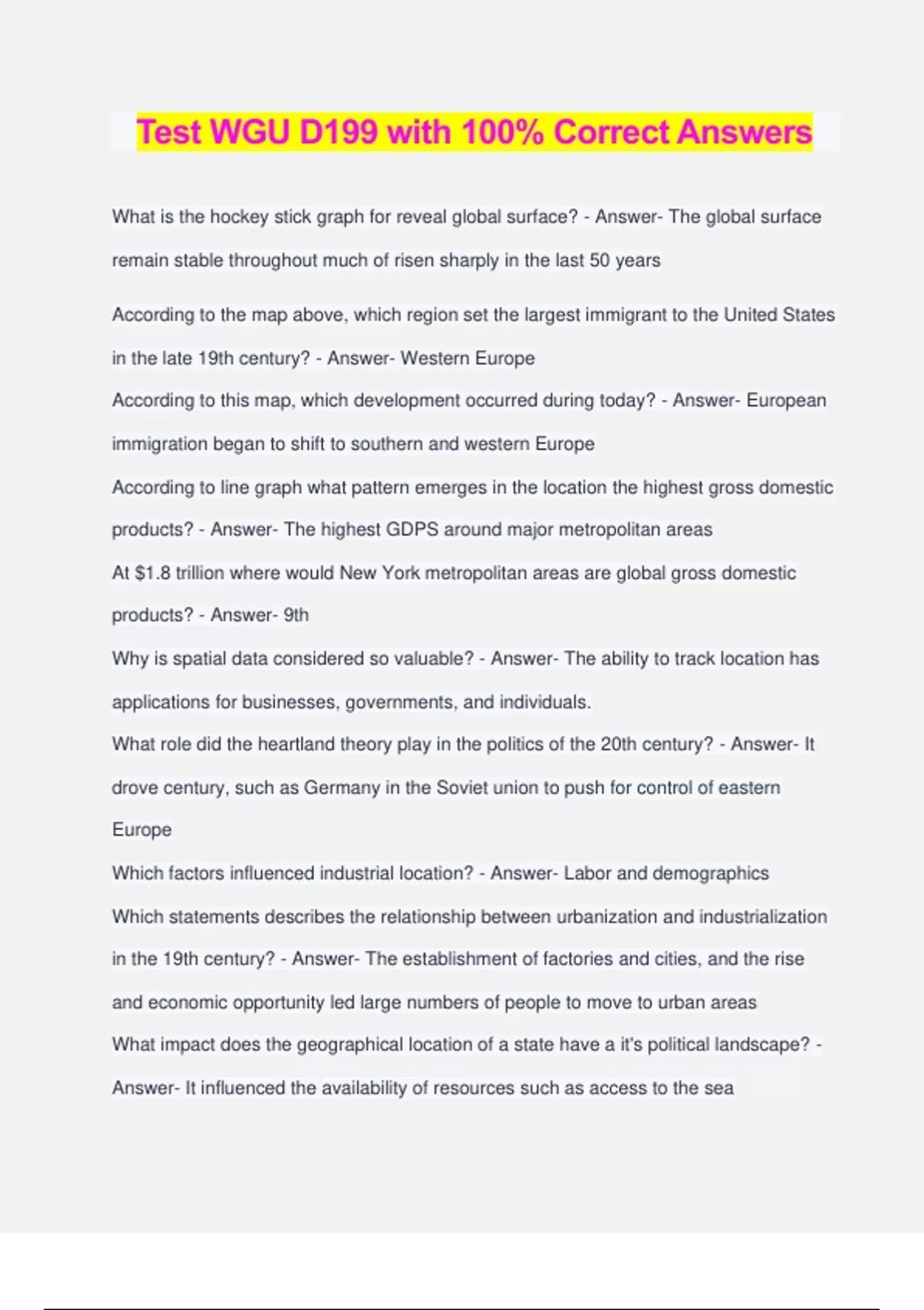 Test WGU D199 with 100% Correct Answers What is the hockey stick graph for reveal global surface? - Answer- The global surface remain stable throughout much of risen sharply in the last 50 years According to the map above, which region set the largest immigrant to the United States in the late 19th century? - Answer- Western Europe According to this map, which development occurred during today? - Answer- European immigration began to shift to southern and western Europe According to line graph what pattern emerges in the location the highest gross domestic products? - Answer- The highest GDPS around major metropolitan areas At $1.8 trillion where would New York metropolitan areas are global gross domestic products? - Answer- 9th Why is spatial data considered so valuable? - Answer- The ability to track location has applications for businesses, governments, and individuals. What role did the heartland theory play in the politics of the 20th century? - Answer- It drove century, such as Germany in the Soviet union to push for control of eastern Europe Which factors influenced industrial location? - Answer- Labor and demographics Which statements describes the relationship between urbanization and industrialization in the 19th century? - Answer- The establishment of factories and cities, and the rise and economic opportunity led large numbers of people to move to urban areas What impact does the geographical location of a state have a it's political landscape? - Answer- It influenced the availability of resources such as access to the sea