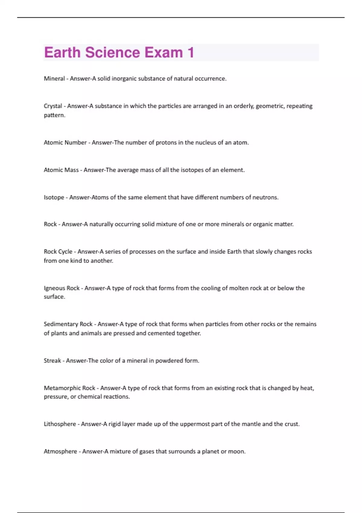Mineral - Answer-A solid inorganic substance of natural occurrence. Crystal - Answer-A substance in which the particles are arranged in an orderly, geometric, repeating pattern. Atomic Number - Answer-The number of protons in the nucleus of an atom. Atomic Mass - Answer-The average mass of all the isotopes of an element. Isotope - Answer-Atoms of the same element that have different numbers of neutrons. Rock - Answer-A naturally occurring solid mixture of one or more minerals or organic matter. Rock Cycle - Answer-A series of processes on the surface and inside Earth that slowly changes rocks from one kind to another. Igneous Rock - Answer-A type of rock that forms from the cooling of molten rock at or below the surface. Sedimentary Rock - Answer-A type of rock that forms when particles from other rocks or the remains of plants and animals are pressed and cemented together. Streak - Answer-The color of a mineral in powdered form. Metamorphic Rock - Answer-A type of rock that forms from an existing rock that is changed by heat, pressure, or chemical reactions. Lithosphere - Answer-A rigid layer made up of the uppermost part of the mantle and the crust. Atmosphere - Answer-A mixture of gases that surrounds a planet or moon.Mantle - Answer-A layer between Earth's crust and the outer core. Inner Core - Answer-A dense sphere of solid iron and nickel at the center of Earth. Outer Core - Answer-A layer of molten iron and nickel that surrounds the inner core of Earth. Moho - Answer-The boundary between the earth's mantle and crust. Pangea - Answer-A supercontinent containing all of Earth's land that existed about 225 million years ago. Hardness - Answer-A measure of how easily a mineral can be scratched. Luster - Answer-The way a mineral reflects light from its surface.
