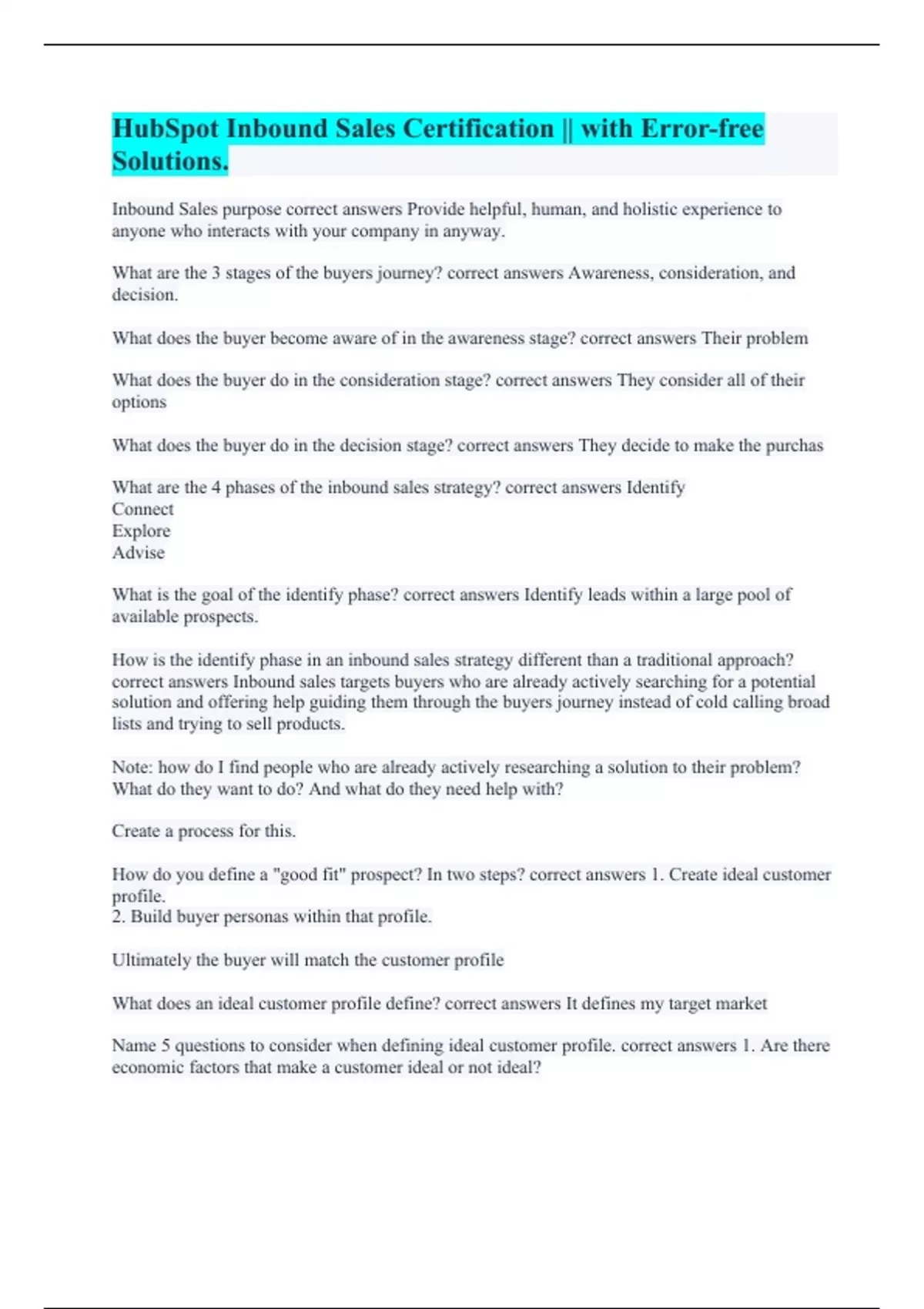Inbound Sales purpose correct answers Provide helpful, human, and holistic experience to anyone who interacts with your company in anyway. What are the 3 stages of the buyers journey? correct answers Awareness, consideration, and decision. What does the buyer become aware of in the awareness stage? correct answers Their problem What does the buyer do in the consideration stage? correct answers They consider all of their options What does the buyer do in the decision stage? correct answers They decide to make the purchas What are the 4 phases of the inbound sales strategy? correct answers Identify Connect Explore Advise What is the goal of the identify phase? correct answers Identify leads within a large pool of available prospects. How is the identify phase in an inbound sales strategy different than a traditional approach? correct answers Inbound sales targets buyers who are already actively searching for a potential solution and offering help guiding them through the buyers journey instead of cold calling broad lists and trying to sell products. Note: how do I find people who are already actively researching a solution to their problem? What do they want to do? And what do they need help with? Create a process for this. How do you define a "good fit" prospect? In two steps? correct answers 1. Create ideal customer profile. 2. Build buyer personas within that profile. Ultimately the buyer will match the customer profile What does an ideal customer profile define? correct answers It defines my target market Name 5 questions to consider when defining ideal customer profile. correct answers 1. Are there economic factors that make a customer ideal or not ideal?