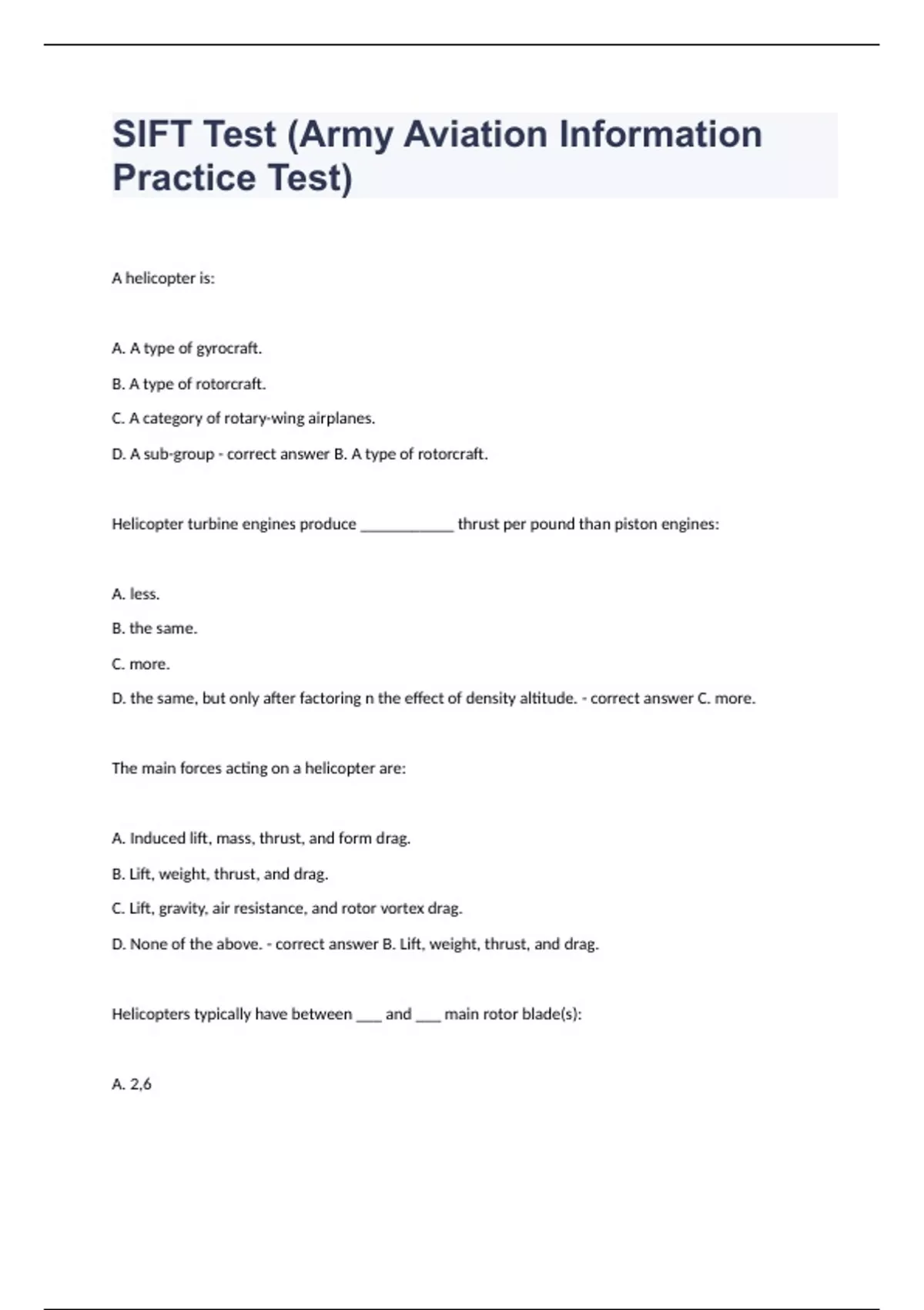 SIFT Test (Army Aviation Information Practice Test) 2024 Updated.A helicopter is: A. A type of gyrocraft. B. A type of rotorcraft. C. A category of rotary-wing airplanes. D. A sub-group - correct answer B. A type of rotorcraft. Helicopter turbine engines produce ___________ thrust per pound than piston engines: A. less. B. the same. C. more. D. the same, but only after factoring n the effect of density altitude. - correct answer C. more. The main forces acting on a helicopter are: A. Induced lift, mass, thrust, and form drag. B. Lift, weight, thrust, and drag. C. Lift, gravity, air resistance, and rotor vortex drag. D. None of the above. - correct answer B. Lift, weight, thrust, and drag. Helicopters typically have between ___ and ___ main rotor blade(s): A. 2,6 B. 2,10 C. 3,8 D. 3,7 - correct answer A. 2,6
