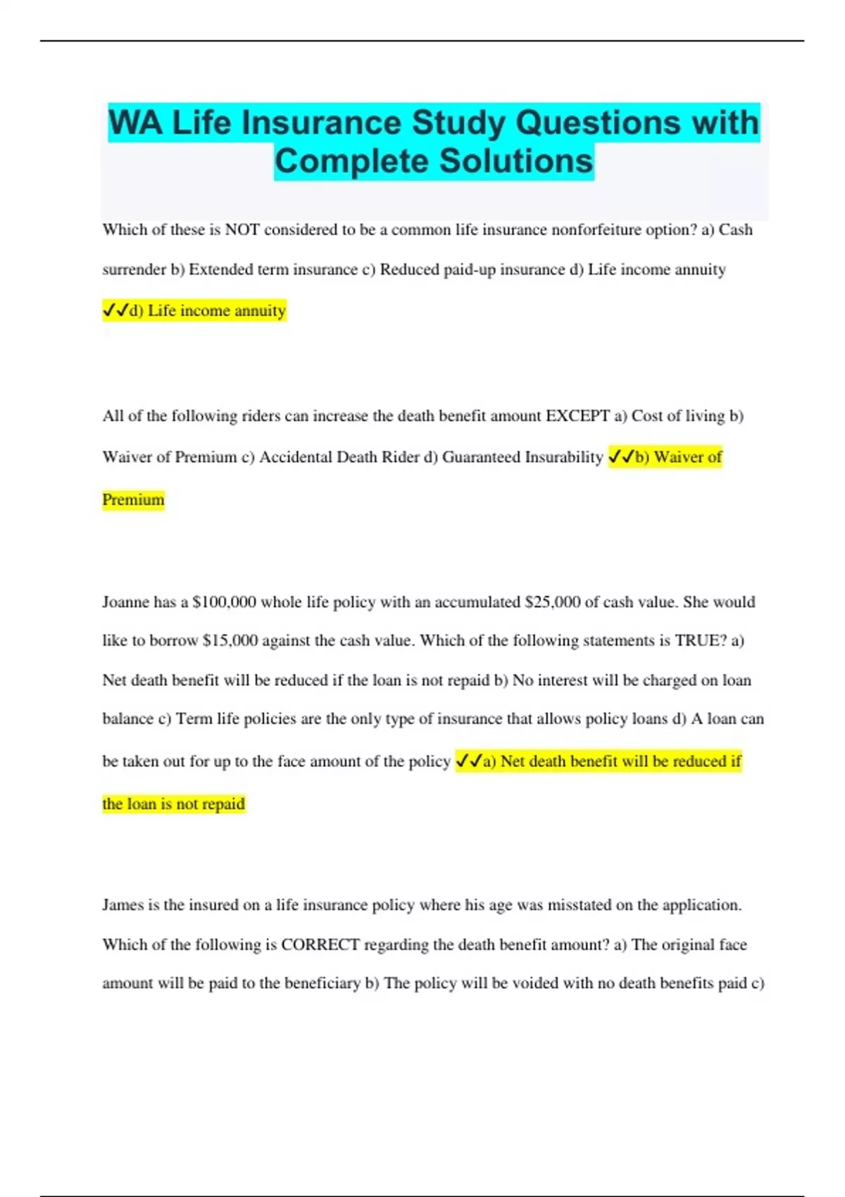 WA Life Insurance Study Questions with Complete Solutions Which of these is NOT considered to be a common life insurance nonforfeiture option? a) Cash surrender b) Extended term insurance c) Reduced paid-up insurance d) Life income annuity d) Life income annuity All of the following riders can increase the death benefit amount EXCEPT a) Cost of living b) Waiver of Premium c) Accidental Death Rider d) Guaranteed Insurability b) Waiver of Premium Joanne has a $100,000 whole life policy with an accumulated $25,000 of cash value. She would like to borrow $15,000 against the cash value. Which of the following statements is TRUE? a) Net death benefit will be reduced if the loan is not repaid b) No interest will be charged on loan balance c) Term life policies are the only type of insurance that allows policy loans d) A loan can be taken out for up to the face amount of the policy a) Net death benefit will be reduced if the loan is not repaid James is the insured on a life insurance policy where his age was misstated on the application. Which of the following is CORRECT regarding the death benefit amount? a) The original face amount will be paid to the beneficiary b) The policy will be voided with no death benefits paid c) The death benefit paid will be what the premium would have purchased at the correct age d) The amount of premiums paid will be returned with interest c) The death benefit paid will be what the premium would have purchased at the correct age Which type of rider will waive the premium on a child's life insurance policy if the parent paying the premium dies? a) Waiver of Premium b) Juvenile Waiver c) Guaranteed Insurability d) Payor benefit d) Payor benefit Which of these is NOT considered to be a nonforfeiture option in a whole life insurance policy? a) Interest only b) Reduced paid-up insurance c) Extended term insurance d) Cash surrender a) Interest only All of the following are considered to be nonforfeiture options available to a policyowner EXCEPT a) Extended Term Insurance b) Cash Surrender c) Reducation of Premium d) Reduced Paid-Up Insurance c) Reduction of Premium Life insurance policies will normally pay for losses arising from a) commercial aviation b) war c) suicide d) hazardous jobs a) commercial aviation If an insured's age on a life insurance policy has been misstated, what is the insurer's liability if the insured dies? a) No death benefit is owed because of the misstatement of age b) The full original death benefit listed on the policy c) A prorated death benefit based on the amount of insurance the insured's premiums would have been if purchased at the correct age d) The original death benefit listed on the policy minus any outstanding loans and interest c) A prorated death benefit based on the amount of insurance the insured's premiums would have been if purchased at the correct age If an insured dies during the grace period with no premiums paid a) the policy would be payable, minus the premium amount b) the policy would be payable only after the beneficiary makes past due premium payment c) all past premiums will be refunded with interest d) the claim would be denied a) the policy would be payable, minus the premium amount All of these are common exclusions to a life insurance policy EXCEPT a) accidental death b) military service c) aviation d) hazardous occupations a) accidental death A life insurance policyowner does NOT