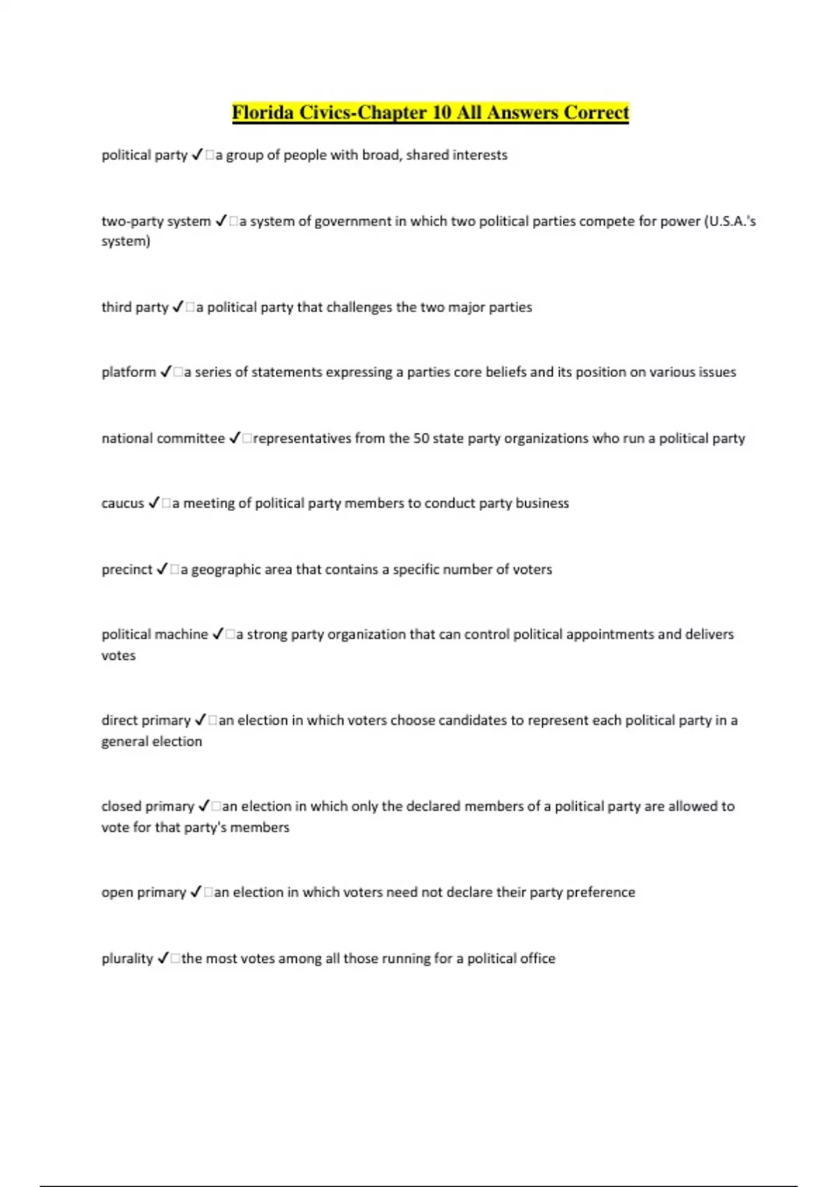 Florida Civics-Chapter 10 All Answers Correct political party ️a group of people with broad, shared interests two-party system ️a system of government in which two political parties compete for power (U.S.A.'s system) third party ️a political party that challenges the two major parties platform ️a series of statements expressing a parties core beliefs and its position on various issues national committee ️representatives from the 50 state party organizations who run a political party caucus ️a meeting of political party members to conduct party business precinct ️a geographic area that contains a specific number of voters political machine ️a strong party organization that can control political appointments and delivers votes direct primary ️an election in which voters choose candidates to represent each political party in a general election closed primary ️an election in which only the declared members of a political party are allowed to vote for that party's members open primary ️an election in which voters need not declare their party preference plurality ️the most votes among all those running for a political office majority ️a number that is more than 50 percent of the total Democratic-Republican Party ️one of the first two political parties of the United States whose platform included state's rights and whose most outspoken member was Thomas Jefferson. Federalist Party ️one of the first two political parties of the United States whose platform included increasing the power of the national government and whose most outspoken member was Alexander Hamilton Democratic Party ️one of the two major parties in the United States today, which was formed in 1825. Andrew Jackson was the party's first elected president. Republican Party ️one of the two major parties in the United States today, which was formed in