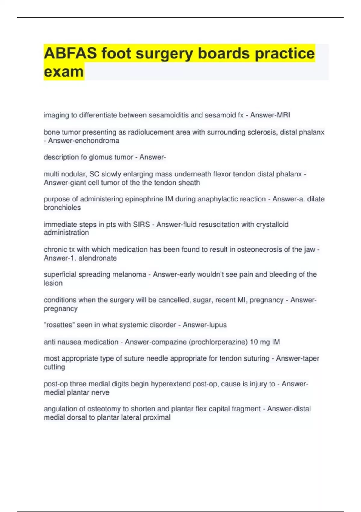 ABFAS foot surgery boards practice exam imaging to differentiate between sesamoiditis and sesamoid fx - Answer-MRI bone tumor presenting as radiolucement area with surrounding sclerosis, distal phalanx - Answer-enchondroma description fo glomus tumor - Answermulti nodular, SC slowly enlarging mass underneath flexor tendon distal phalanx - Answer-giant cell tumor of the the tendon sheath purpose of administering epinephrine IM during anaphylactic reaction - Answer-a. dilate bronchioles immediate steps in pts with SIRS - Answer-fluid resuscitation with crystalloid administration chronic tx with which medication has been found to result in osteonecrosis of the jaw - Answer-1. alendronate superficial spreading melanoma - Answer-early wouldn't see pain and bleeding of the lesion conditions when the surgery will be cancelled, sugar, recent MI, pregnancy - Answerpregnancy "rosettes" seen in what systemic disorder - Answer-lupus anti nausea medication - Answer-compazine (prochlorperazine) 10 mg IM most appropriate type of suture needle appropriate for tendon suturing - Answer-taper cutting post-op three medial digits begin hyperextend post-op, cause is injury to - Answermedial plantar nerve