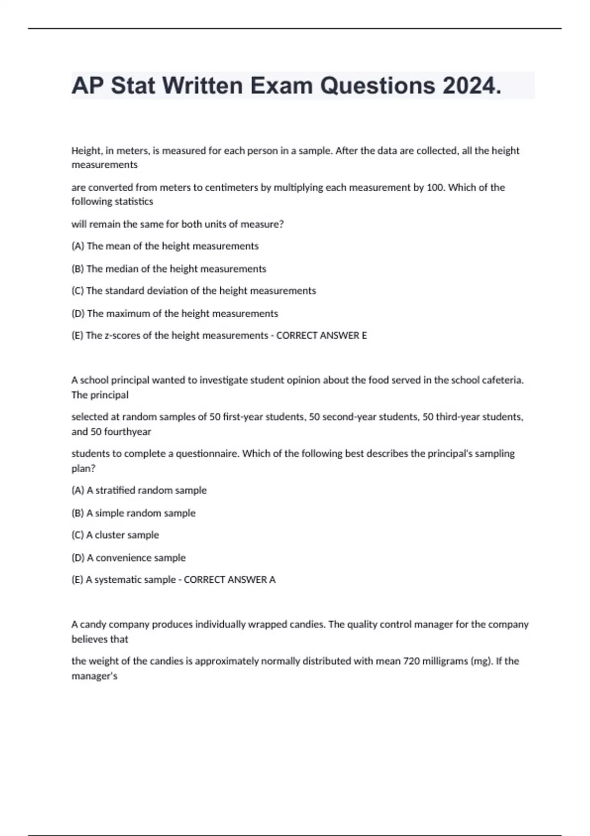 AP Stat Written Exam Questions 2024. Height, in meters, is measured for each person in a sample. After the data are collected, all the height measurements are converted from meters to centimeters by multiplying each measurement by 100. Which of the following statistics will remain the same for both units of measure? (A) The mean of the height measurements (B) The median of the height measurements (C) The standard deviation of the height measurements (D) The maximum of the height measurements (E) The z-scores of the height measurements - CORRECT ANSWER E A school principal wanted to investigate student opinion about the food served in the school cafeteria. The principal selected at random samples of 50 first-year students, 50 second-year students, 50 third-year students, and 50 fourthyear students to complete a questionnaire. Which of the following best describes the principal's sampling plan? (A) A stratified random sample (B) A simple random sample (C) A cluster sample (D) A convenience sample (E) A systematic sample - CORRECT ANSWER A A candy company produces individually wrapped candies. The quality control manager for the company believes that the weight of the candies is approximately normally distributed with mean 720 milligrams (mg). If the manager's