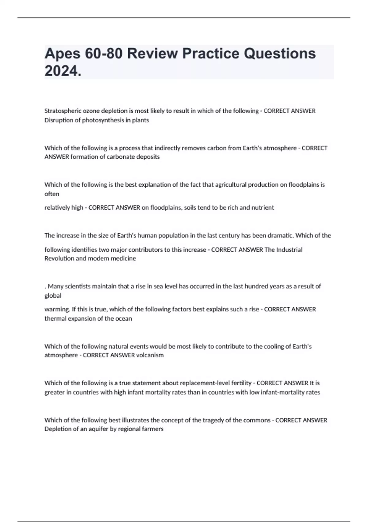 Apes 60-80 Review Practice Questions 2024. Stratospheric ozone depletion is most likely to result in which of the following - CORRECT ANSWER Disruption of photosynthesis in plants Which of the following is a process that indirectly removes carbon from Earth's atmosphere - CORRECT ANSWER formation of carbonate deposits Which of the following is the best explanation of the fact that agricultural production on floodplains is often relatively high - CORRECT ANSWER on floodplains, soils tend to be rich and nutrient The increase in the size of Earth's human population in the last century has been dramatic. Which of the following identifies two major contributors to this increase - CORRECT ANSWER The Industrial Revolution and modem medicine . Many scientists maintain that a rise in sea level has occurred in the last hundred years as a result of global warming. If this is true, which of the following factors best explains such a rise - CORRECT ANSWER thermal expansion of the ocean Which of the following natural events would be most likely to contribute to the cooling of Earth's atmosphere - CORRECT ANSWER volcanism
