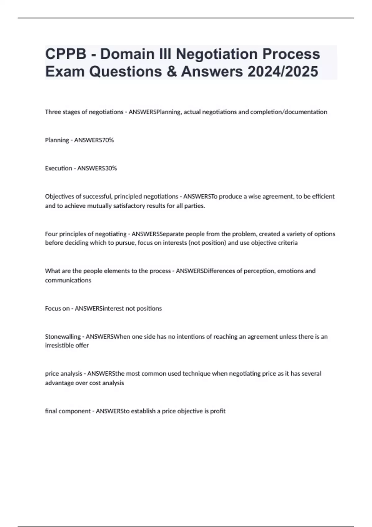CPPB - Domain III Negotiation Process Exam Questions & Answers 2024/2025