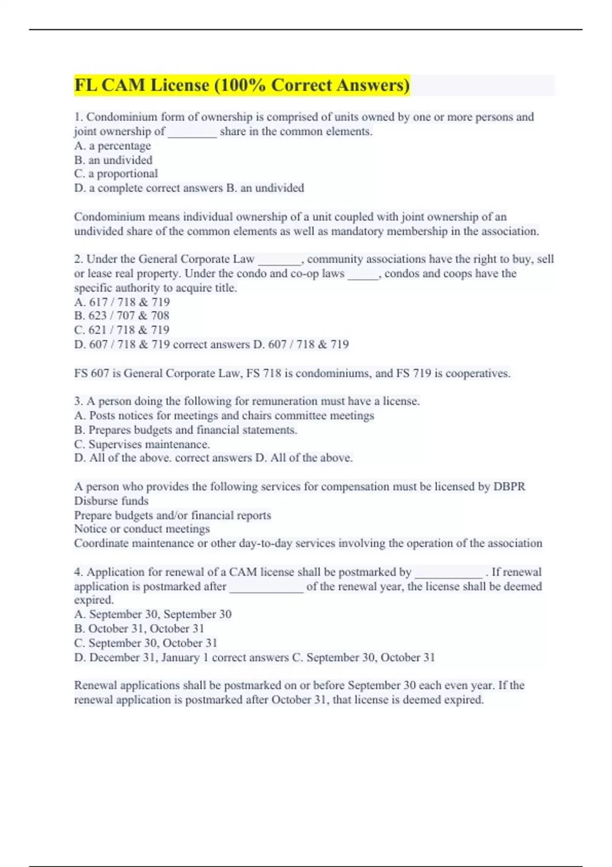 1. Condominium form of ownership is comprised of units owned by one or more persons and joint ownership of ________ share in the common elements. A. a percentage B. an undivided C. a proportional D. a complete correct answers B. an undivided Condominium means individual ownership of a unit coupled with joint ownership of an undivided share of the common elements as well as mandatory membership in the association. 2. Under the General Corporate Law _______, community associations have the right to buy, sell or lease real property. Under the condo and co-op laws _____, condos and coops have the specific authority to acquire title. A. 617 / 718 & 719 B. 623 / 707 & 708 C. 621 / 718 & 719 D. 607 / 718 & 719 correct answers D. 607 / 718 & 719 FS 607 is General Corporate Law, FS 718 is condominiums, and FS 719 is cooperatives. 3. A person doing the following for remuneration must have a license. A. Posts notices for meetings and chairs committee meetings B. Prepares budgets and financial statements. C. Supervises maintenance. D. All of the above. correct answers D. All of the above. A person who provides the following services for compensation must be licensed by DBPR Disburse funds Prepare budgets and/or financial reports Notice or conduct meetings Coordinate maintenance or other day-to-day services involving the operation of the association 4. Application for renewal of a CAM license shall be postmarked by ___________ . If renewal application is postmarked after ____________ of the renewal year, the license shall be deemed expired. A. September 30, September 30 B. October 31, October 31 C. September 30, October 31 D. December 31, January 1 correct answers C. September 30, October 31 Renewal applications shall be postmarked on or before September 30 each even year. If the renewal application is postmarked after October 31, that license is deemed expired.