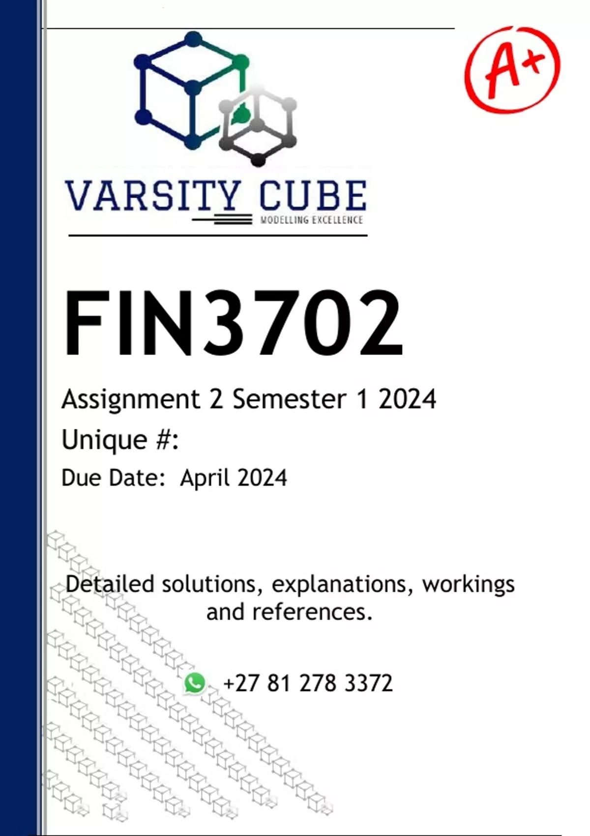 FIN3702 Assignment 2 (DETAILED ANSWERS) Semester 1 2024 - DISTINCTION GUARANTEED - DISTINCTION GUARANTEED - DISTINCTION GUARANTEED Answers, guidelines, workings and references ......... Question 1 Not yet answered Marked out of 1.00 QUIZ Commercial banks lend unsecured short-term funds in the following three basicways. 1. Single-payment notes, lines ofcredit, and commercial paper. 2. Single-payment notes, lines ofcredit, and revolving creditagreements. 3. Single-payment notes, revolvingcredit agreements, andcommercial paper. 4. Commercial paper, lines ofcredit, and revolving creditagreements. Question 2 Not yet answered Marked out of 1.00 Question 3 Not yet answered Marked out of 1.00 Tinashe Mining borrowed R100 000 forone year under a line of credit with astated interest rate of 7.5% and a 15%compensating balance. Normally, thefi rm keeps almost no money in itschecking account. Based on thisinformation, the effective annual interestrate on the loan is approximately … 1. 7.2%. 2. 7.5%. 3. 8.0%. 4. 8.8%. In the next planning period, a fi rm plansto change its policy of all cash sales andinitiate a credit policy requiring paymentwithin 30 days. The statements that willbe directly affected immediately are the… 1. pro forma balance sheet andcash budget. 2. cash budget and statement ofretained earnings. 3. pro forma income statement andpro forma balance sheet. 4. pro forma income statement, proforma balance sheet and cashbudget. Question 4 Not yet answered Marked out of 1.00 Other things held constant, which of thefollowing would tend to reduce the cashconversion cycle? 1. Take all discounts that areoffered. 2. Offer longer payment terms tocustomers. 3. Carry a constant amount ofreceivables as sales decline. 4. Continue to take all discountsthat are offered and pay on thenet date. 5. Place larger orders for rawmaterials to take advantage ofprice breaks. Question 5 Not yet answered Marked out of 1.00 Which one of the following statements isNOT correct? 1. Credit policy has an impact onthe working capital because itinfl uences both sales and thetime before receivables arecollected 2. The cash budget is useful tohelp estimate future fi nancingneeds, especially the need forshort-term working capitalloans. 3. If a fi rm wants to generate morecash fl ow from operations in thenext month or two, it couldchange its credit policy from2/10 net 30 to net 60. 4. Managing working capital isimportant because it infl uencesfi nancing decisions and thefi rm’s profi tability 5. A company may hold a relativelylarge amount of cash andmarketable securities it if isuncertain about the volume ofsales, profi ts, and cash fl owsduring the coming year. Question 6 Not yet answered Marked out of 1.00 Which of the following statements iscorrect? 1. Commercial paper is a form ofshort-term fi nancing that isprimarily used by large, strong,and fi nancially stablecompanies. 2. Short-term debt is favoured byfi rms because while it isgenerally more expensive thanlong-term debt, it exposes theborrowing fi rm to less risk thanlong-term debt. 3. Commercial paper can be issuedby virtually any fi rm so long as itis willing to pay the goinginterest rate. 4. Commercial paper is typicallyoffered at a long-term maturityof at least fi ve years. Question 7 Not yet answered Marked out of 1.00 Question 8 Not yet answered Marked out of 1.00 Sibusiso Investments Ltd registered anegative net cash fl ow last year, yet itscash on the balance sheet increased.What could explain this event? 1. The company issued long-termdebt. 2. The company sold some of itsassets. 3. The company repurchased someof its ordinary shares. 4. Statements 1 and 2 are correct. 5. Statements 1 and 3 are correct A fi rm has notes payable of R1 546 000,long-term debt of R and totalinterest expenses of R1 300 000. If thefi rm pays 8% on its long-term debt, whatrate does it pay on its notes payable.? 1. 8.20%. 2. 13.10%. 3. 16.80%. 4. 15.30%. 5. 18.00%. Question 9 Not yet answered Marked out of 1.00 Which of the following is most consistent with effi cient inventory management?The fi rm has a … 1. relatively low ACP 2. relatively high current ratio. 3. below average total assetsturnover ratio. 4. below average inventoryturnover ratio. 5. below average inventoryturnover ratio. Question 10 Not yet answered Marked out of 1.00 Ignoring cost and other effects on thefi rm, which of the following measureswould tend to reduce the cashconversion cycle? 1. Take discounts when offered. 2. Offer longer payment periods tocustomers. 3. Forego discounts that arecurrently being taken. 4. Maintain the same level ofreceivables as sales decrease. 5. Buy more raw materials to takeadvantage of price breaks. Question 11 Not yet answered Marked out of 1.00 What is the fi rm’s marginal profi tcontribution under the proposed plan? The information below applies to thenext three questions. Deals, Inc . currently makes all art saleson credit and offers no cash discount.The fi rm is considering a 3% cashdiscount for payment within 10 days. Thefi rm's current average collection period is90 days, sales are 400 art pieces per yearand selling price is R25 000 per art piece.Variable cost per item is R18 750 and theaverage cost per item is R21 000. Thefi rm expects that the change in creditterms will result in a minor increase insales of 10 items per year, that 75% ofthe sales will take the discount, and theaverage collection period will drop to 30days. The fi rm's bad debt expense isexpected to become negligible under theproposed plan. The bad debt expense iscurrently 0.5% of sales. The fi rm'srequired return on equal-risk investmentsis 20%. Question 11 What is the fi rm’s marginal profi tcontribution under the proposed plan? 1. R 22 500 2. R 40 000 3. R 62 500 4. R100 000 Question 12 Not yet answered Marked out of 1.00 Question 13 Not yet answered Marked out of 1.00 What is the cost of marginal investmentin accounts receivable under theproposed plan? 1. R246 875 2. R276 500 3. R313 460 4. R368 3