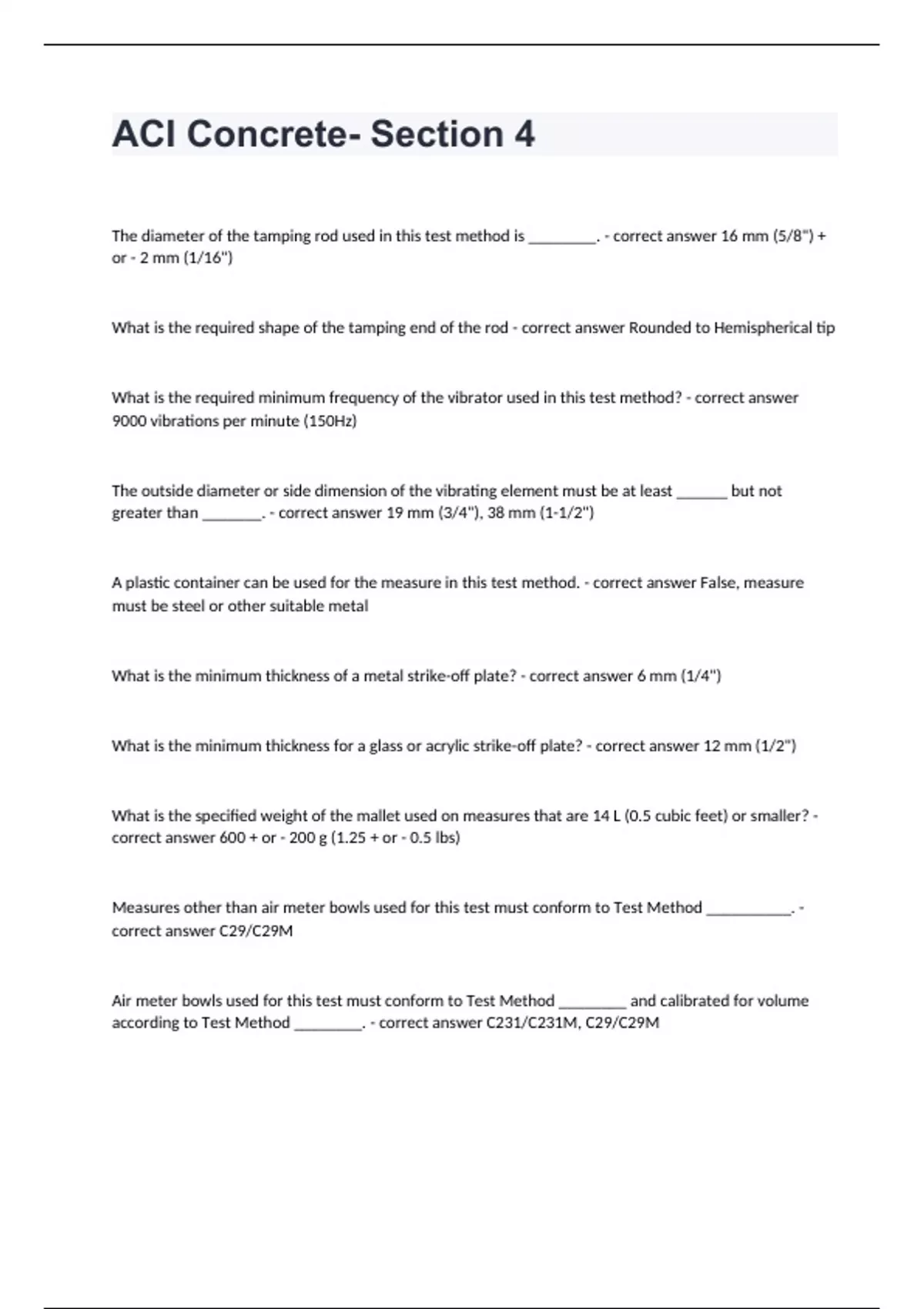 ACI Concrete- Section 4The diameter of the tamping rod used in this test method is ________. - correct answer 16 mm (5/8") + or - 2 mm (1/16") What is the required shape of the tamping end of the rod - correct answer Rounded to Hemispherical tip What is the required minimum frequency of the vibrator used in this test method? - correct answer 9000 vibrations per minute (150Hz) The outside diameter or side dimension of the vibrating element must be at least ______ but not greater than _______. - correct answer 19 mm (3/4"), 38 mm (1-1/2") A plastic container can be used for the measure in this test method. - correct answer False, measure must be steel or other suitable metal What is the minimum thickness of a metal strike-off plate? - correct answer 6 mm (1/4") What is the minimum thickness for a glass or acrylic strike-off plate? - correct answer 12 mm (1/2") What is the specified weight of the mallet used on measures that are 14 L (0.5 cubic feet) or smaller? - correct answer 600 + or - 200 g (1.25 + or - 0.5 lbs) Measures other than air meter bowls used for this test must conform to Test Method __________. - correct answer C29/C29M Air meter bowls used for this test must conform to Test Method ________ and calibrated for volume according to Test Method ________. - correct answer C231/C231M, C29/C29M