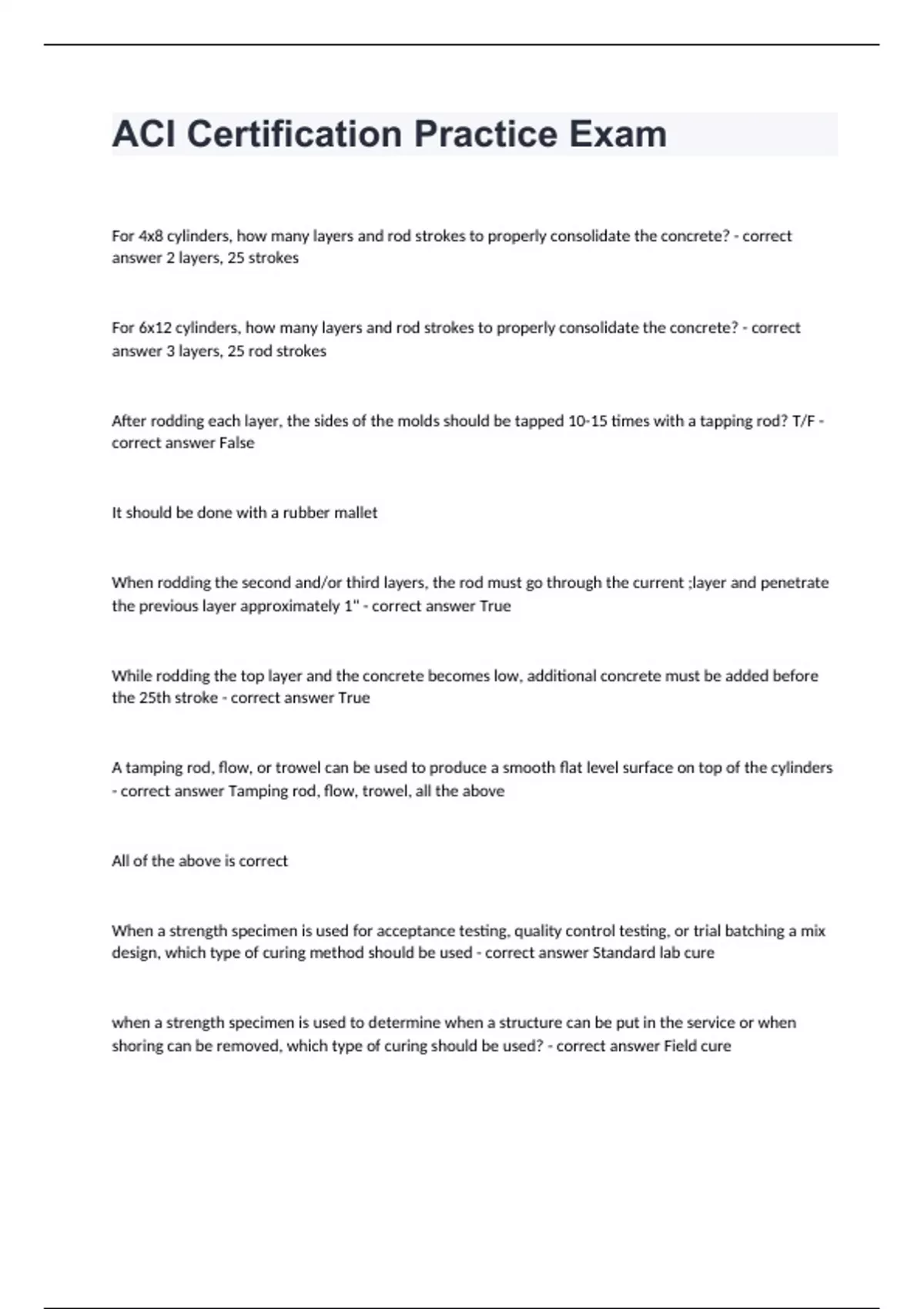 ACI Certification Practice ExamFor 4x8 cylinders, how many layers and rod strokes to properly consolidate the concrete? - correct answer 2 layers, 25 strokes For 6x12 cylinders, how many layers and rod strokes to properly consolidate the concrete? - correct answer 3 layers, 25 rod strokes After rodding each layer, the sides of the molds should be tapped 10-15 times with a tapping rod? T/F - correct answer False It should be done with a rubber mallet When rodding the second and/or third layers, the rod must go through the current ;layer and penetrate the previous layer approximately 1" - correct answer True While rodding the top layer and the concrete becomes low, additional concrete must be added before the 25th stroke - correct answer True A tamping rod, flow, or trowel can be used to produce a smooth flat level surface on top of the cylinders - correct answer Tamping rod, flow, trowel, all the above All of the above is correct When a strength specimen is used for acceptance testing, quality control testing, or trial batching a mix design, which type of curing method should be used - correct answer Standard lab cure when a strength specimen is used to determine when a structure can be put in the service or when shoring can be removed, which type of curing should be used? - correct answer Field cure