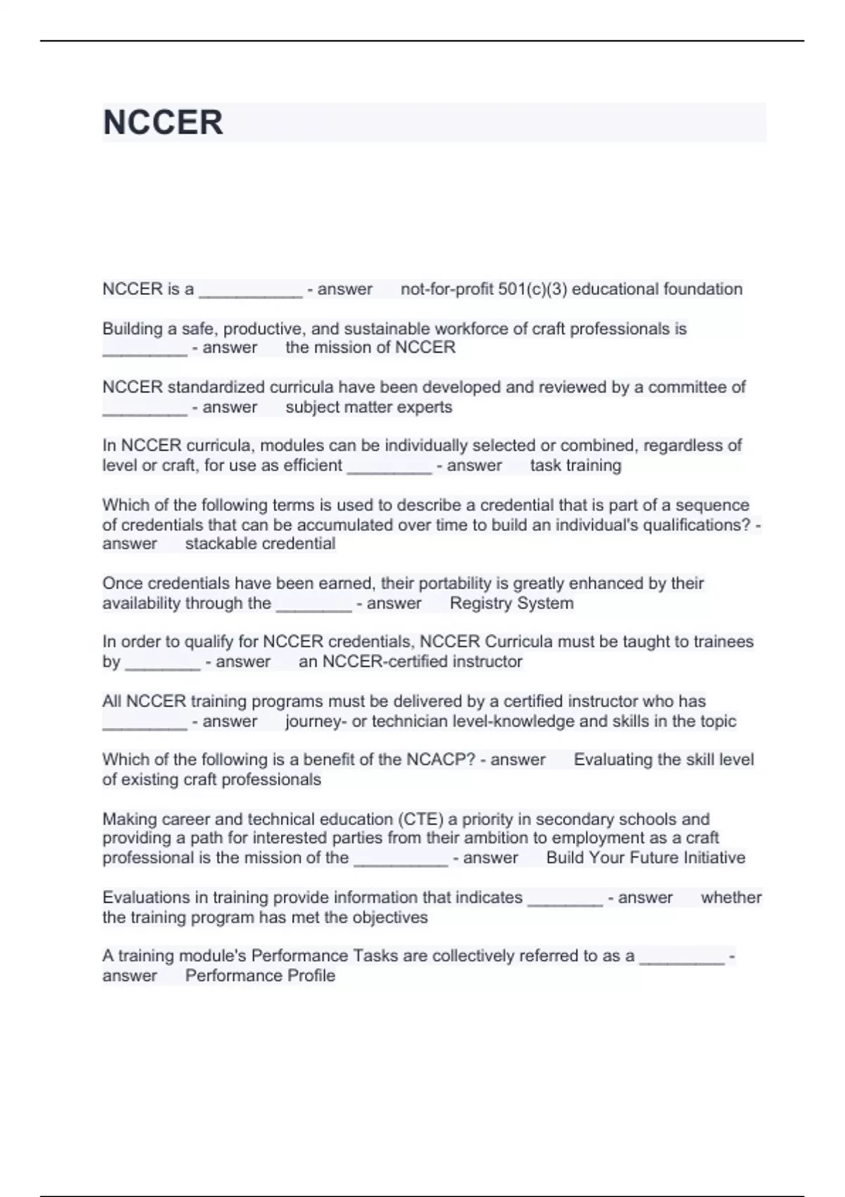 NCCER Questions and Answers 2024