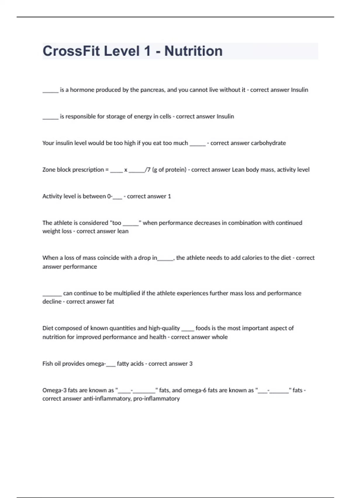 Crossfit Level 1 - Nutrition Practice Study Guide Questions 2024. _____ is a hormone produced by the pancreas, and you cannot live without it - correct answer Insulin _____ is responsible for storage of energy in cells - correct answer Insulin Your insulin level would be too high if you eat too much _____ - correct answer carbohydrate Zone block prescription = ____ x _____/7 (g of protein) - correct answer Lean body mass, activity level Activity level is between 0-___ - correct answer 1 The athlete is considered "too _____" when performance decreases in combination with continued weight loss - correct answer lean When a loss of mass coincide with a drop in_____, the athlete needs to add calories to the diet - correct answer performance ______ can continue to be multiplied if the athlete experiences further mass loss and performance decline - correct answer fat Diet composed of known quantities and high-quality ____ foods is the most important aspect of nutrition for improved performance and health - correct answer whole Fish oil provides omega-___ fatty acids - correct answer 3 Omega-3 fats are known as "____-_______" fats, and omega-6 fats are known as "___-______" fats - correct answer anti-inflammatory, pro-inflammatory