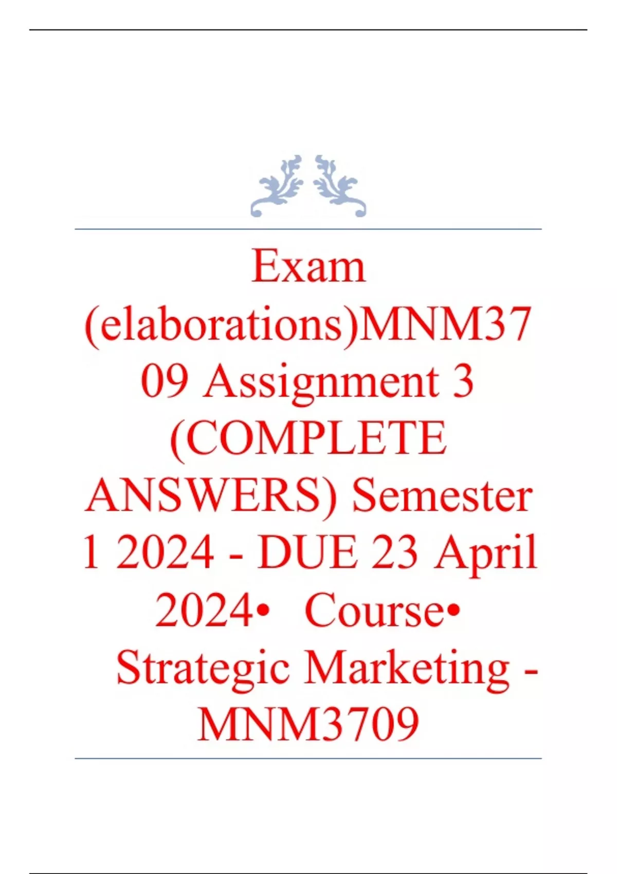 Exam (elaborations) MNM3709 Assignment 3 (COMPLETE ANSWERS) Semester 1 2024 - DUE 23 April 2024 • Course • Strategic Marketing - MNM3709 (MNM3709) • Institution • University Of South Africa (Unisa) • Book • Strategic Marketing