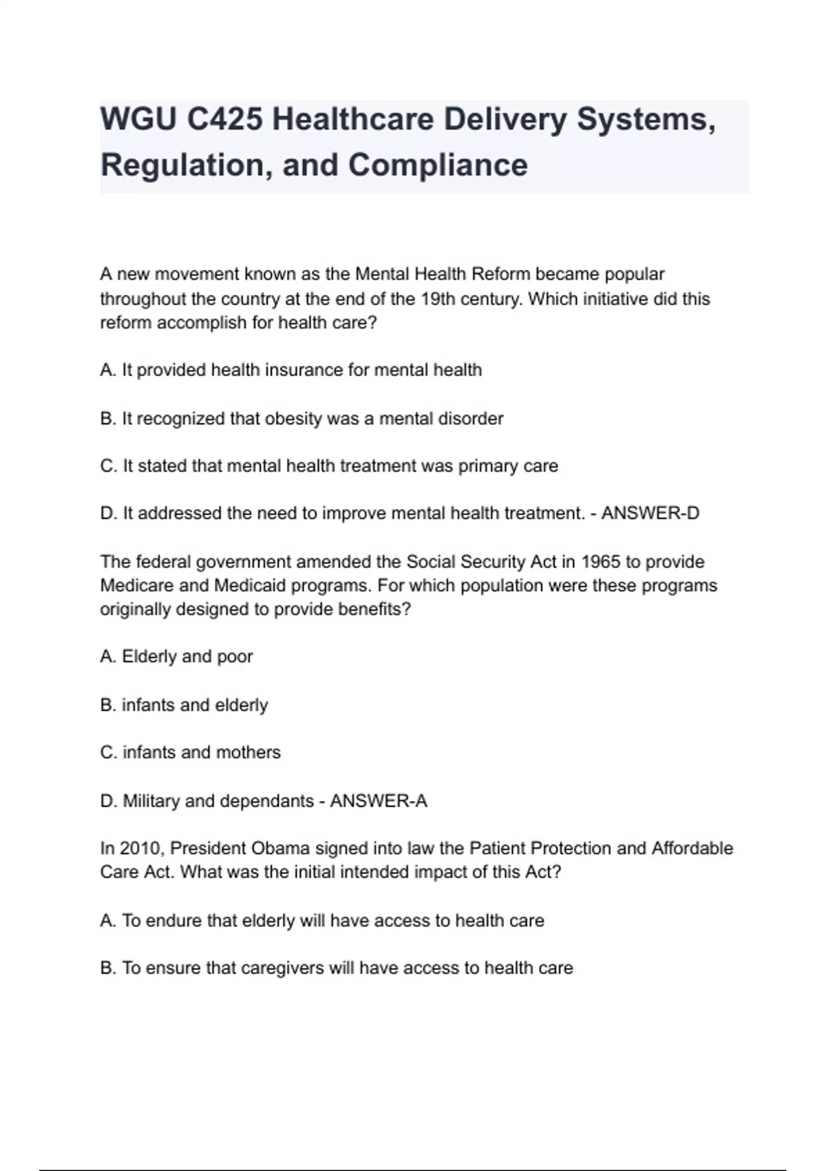 WGU C425 Healthcare Delivery Systems, Regulation, and Compliance