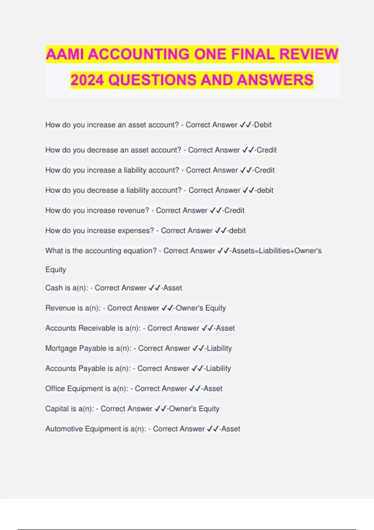 AAMI ACCOUNTING ONE FINAL REVIEW 2024 QUESTIONS AND ANSWERS How do you increase an asset account? - Correct Answer ️️ -Debit How do you decrease an asset account? - Correct Answer ️️ -Credit How do you increase a liability account? - Correct Answer ️️ -Credit How do you decrease a liability account? - Correct Answer ️️ -debit How do you increase revenue? - Correct Answer ️️ -Credit How do you increase expenses? - Correct Answer ️️ -debit What is the accounting equation? - Correct Answer ️️ -Assets=Liabilities+Owner's Equity Cash is a(n): - Correct Answer ️️ -Asset Revenue is a(n): - Correct Answer ️️ -Owner's Equity Accounts Receivable is a(n): - Correct Answer ️️ -Asset Mortgage Payable is a(n): - Correct Answer ️️ -Liability Accounts Payable is a(n): - Correct Answer ️️ -Liability Office Equipment is a(n): - Correct Answer ️️ -Asset Capital is a(n): - Correct Answer ️️ -Owner's Equity Automotive Equipment is a(n): - Correct Answer ️️ -Asset
