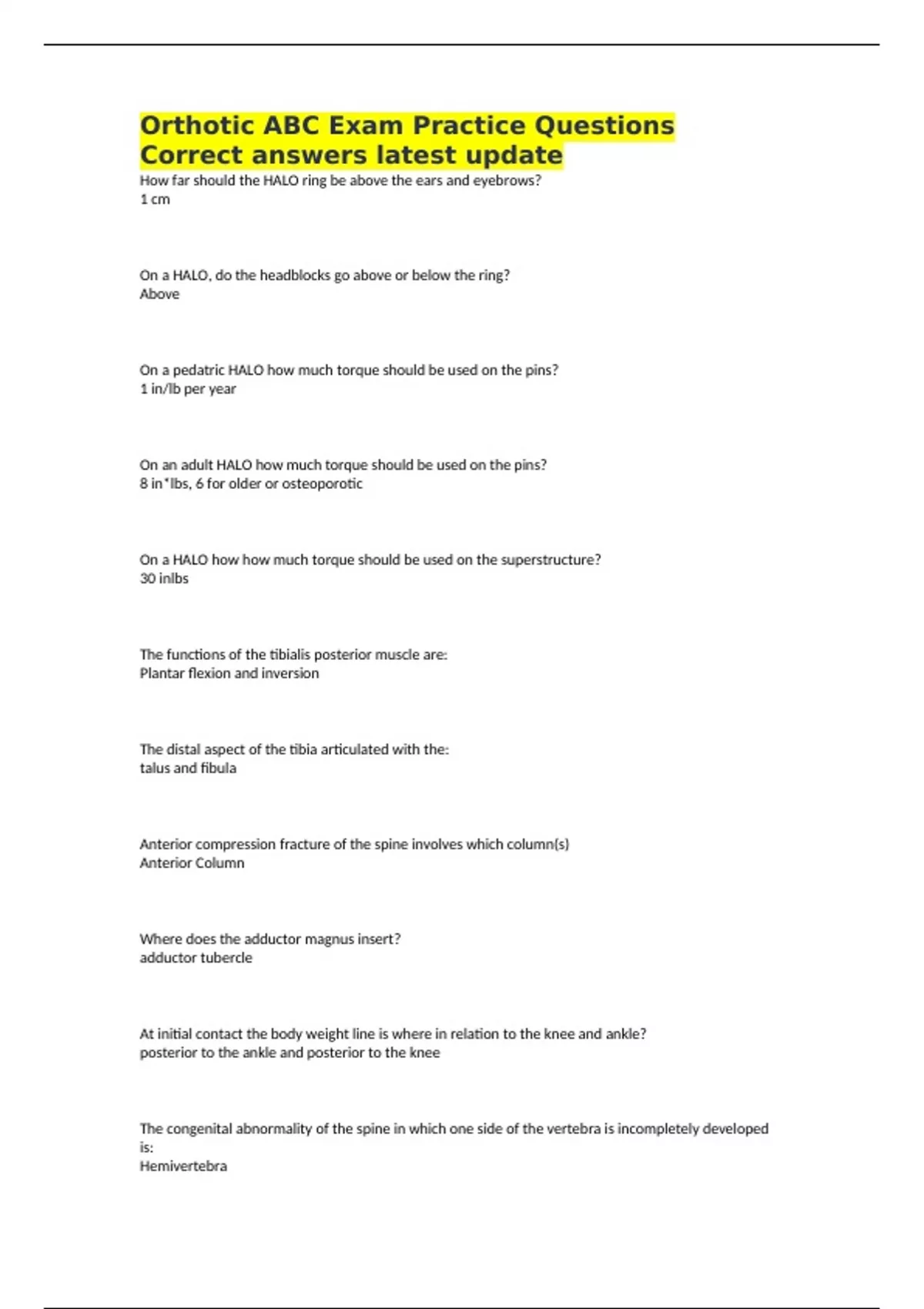 Orthotic ABC Exam Practice Questions Correct answers latest update How far should the HALO ring be above the ears and eyebrows? 1 cm On a HALO, do the headblocks go above or below the ring? Above On a pedatric HALO how much torque should be used on the pins? 1 in/lb per year On an adult HALO how much torque should be used on the pins? 8 in*lbs, 6 for older or osteoporotic On a HALO how how much torque should be used on the superstructure? 30 inlbs The functions of the tibialis posterior muscle are: Plantar flexion and inversion The distal aspect of the tibia articulated with the: talus and fibula Anterior compression fracture of the spine involves which column(s) Anterior Column Where does the adductor magnus insert? adductor tubercle At initial contact the body weight line is where in relation to the knee and ankle? posterior to the ankle and posterior to the knee The congenital abnormality of the spine in which one side of the vertebra is incompletely developed is: Hemivertebra The C-Bar on a hand orthosis acts as a : Thumb adduction stop What double adjustable configuration should be used for a pt with Fair (2/5) plantar flexion strength, and good (4/5) dorsiflexion strength? Anterior Pins and Posterior Springs In an AFO, trimming the footplate proximal to the met heads will MOST effect which rocker? the third rocker The Primary goal of a corrective scoliosis orthosis in the treatment of moderate adolescent idiopathic scoliosis is: to prevent progression of the curve The patient is experiencing recurrent positional posterior dislocation after hip replacement surgery. The Primary goal of a hip abduction orthosis is to block what? Hip flexion When fabricating a thermoplastic articulated AFO, the mechanical ankle joints should be placed at the level of the: Distal border of the medial maleolus The standard lateral inferior trimline for a single piece anterior opening custom LSO is: 2 cm or 3/4 inch superior to the greater trochanter While fitting a ground reaction AFO you observe good control of the patients knee in the agittel place however the patient complains they are having difficulty initiating swing on the side with the orthosis. The most appropriate modification would be : Add a 1/4 inch heel wedge underneath the AFO The main functional goal of a posterior off-set unlocked knee joint is to: Provide increased stability during stance (this is a better answer than to prevent buckling at initial contact) During the casting of an ambulatory child with CP for custom bilateral solid ankle AFOs you note that the right side lacks dorsiflexion range of motion (-5 degrees) with the knee extended. The MOST appropriate way to address this is: Cast in -5 degrees of dorsiflexion and plan to add an external heel wedge. At a follow up visit for a patient who was fit with bilateral solid ankle AFOs, you note redness at the navicular on the right side. What modifications should you make to the AFO? Add an ST pad and padding just superior to the medial maleolus A patient was fit with a pair of custom semi-rigid orthoses two weeks ago. They are now complaining of discomfort on the plantar aspect of their feet, just proximal to the 1st met heads. The MOST likely cause of this problem is what? Lack of relief for the flexor hallicus longus tendon. A patient with positional plagiocephaly has been wearing a custom cranial remolding orthosis for the past 8 months. The patient is not 15 months old and has outgornw the orthosis. The practitioner should expect the physician will: Discontinue orthotic treatment since the childs head growth has plateaued. You are seeing a patient who has recently relocated to the area. They are currently wearing a Cruciform Anterior Stabilization Hyperextension(CASH) orthosis. The patient states they cannot tolerate the orthosis due to pressure on an ostomy which is located at the midline of the abdomen, superior to the umbillicus. What is the best option to address this problem? Suggest switchin to a Jewett style orthosis. After providing a device to a Medicare beneficiary, the practitioner must provide any adjustments or repairs without charge for how long? 90 Days The rules relating to the safe use of potentially hazardous materials in the fabrication of orthoses are under the jurisdiction of what organization? Occupational Safety and Health Administration (OSHA) Infection control practices used to prevent transmission of diseases that can be acquired by contact with blood, bodily fluids, non-intact akin and mucous membranes are referred to as: Standard Precautions If the practitioners facility is designated as a participating supplier, this means that: You must accept the Medicare allowable amount as payment in full. The muscle that has the PRIMARY responsibility of rotating the thumb to touch the tips of the index and middle fingers is the : Opponens Pollicis What is the most important factor in decreasing the vertical loading of the lumbar spine? Enhancing the abdominal hydropneumatic mechanism In which of the following conditions is a Milwaukee CTLSO contraindicated? a. Skeletal immaturity, b. idiopathic scoliosis, c. thoracolumbar curves, d. curves greater than 60 degrees D. Curves greater than 60 degrees The measurement for a TLSO ( anterior hyperextension orthosis) should be taken with the patient in what position? Lying Supine Which of the following Orthoses is designed to manage spondylolisthesis in an active teenage? a. Corset, b. Knight, c. Jewitt, d. Anterior Overlap LSO d. Anterior Overlap LSO The trim lines of a ground reaction AFO should be anterior to the malleoli to serve as a : Dorsiflexion Stop The orthotic recommendation for treating a patient with an ulnar nerve lesion at the wrist is an opponens orthosis plus what component? MP stop When treating a patient with a knee flexion contracture, what is the most appropriate knee joint to use when designing a KAFO? Dial Lock Joint Facilities material safety data sheets should be: Read by all staff that uses the