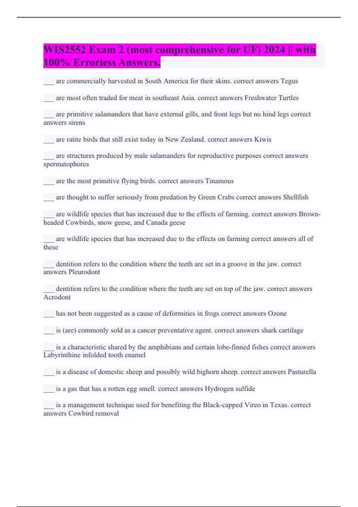 ___ are commercially harvested in South America for their skins. correct answers Tegus ___ are most often traded for meat in southeast Asia. correct answers Freshwater Turtles ___ are primitive salamanders that have external gills, and front legs but no hind legs correct answers sirens ___ are ratite birds that still exist today in New Zealand. correct answers Kiwis ___ are structures produced by male salamanders for reproductive purposes correct answers spermatophores ___ are the most primitive flying birds. correct answers Tinamous ___ are thought to suffer seriously from predation by Green Crabs correct answers Shellfish ___ are wildlife species that has increased due to the effects of farming. correct answers Brown-headed Cowbirds, snow geese, and Canada geese ___ are wildlife species that has increased due to the effects on farming correct answers all of these ___ dentition refers to the condition where the teeth are set in a groove in the jaw. correct answers Pleurodont ___ dentition refers to the condition where the teeth are set on top of the jaw. correct answers Acrodont ___ has not been suggested as a cause of deformities in frogs correct answers Ozone ___ is (are) commonly sold as a cancer preventative agent. correct answers shark cartilage ___ is a characteristic shared by the amphibians and certain lobe-finned fishes correct answers Labyrinthine infolded tooth enamel ___ is a disease of domestic sheep and possibly wild bighorn sheep. correct answers Pasturella ___ is a gas that has a rotten egg smell. correct answers Hydrogen sulfide ___ is a management technique used for benefiting the Black-capped Vireo in Texas. correct answers Cowbird removal