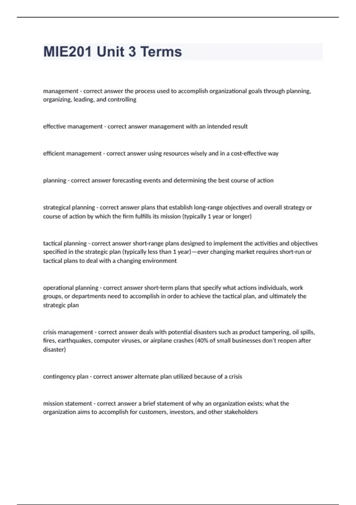 MIE201 Unit 3 Termsmanagement - correct answer the process used to accomplish organizational goals through planning, organizing, leading, and controlling effective management - correct answer management with an intended result efficient management - correct answer using resources wisely and in a cost-effective way planning - correct answer forecasting events and determining the best course of action strategical planning - correct answer plans that establish long-range objectives and overall strategy or course of action by which the firm fulfills its mission (typically 1 year or longer) tactical planning - correct answer short-range plans designed to implement the activities and objectives specified in the strategic plan (typically less than 1 year)—ever changing market requires short-run or tactical plans to deal with a changing environment operational planning - correct answer short-term plans that specify what actions individuals, work groups, or departments need to accomplish in order to achieve the tactical plan, and ultimately the strategic plan crisis management - correct answer deals with potential disasters such as product tampering, oil spills, fires, earthquakes, computer viruses, or airplane crashes (40% of small businesses don't reopen after disaster) contingency plan - correct answer alternate plan utilized because of a crisis mission statement - correct answer a brief statement of why an organization exists; what the organization aims to accomplish for customers, investors, and other stakeholders
