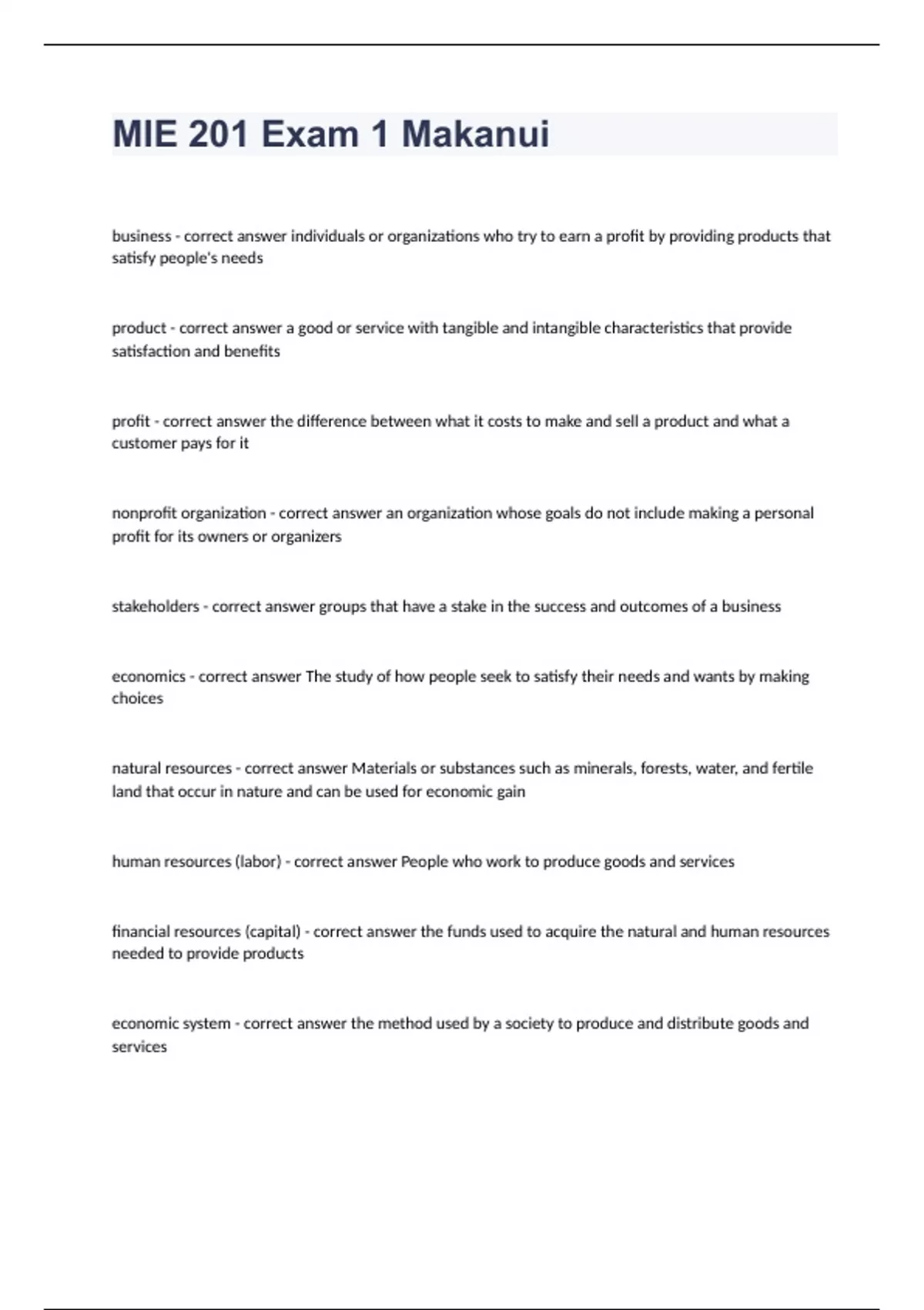 MIE 201 Exam 1 business - correct answer individuals or organizations who try to earn a profit by providing products that satisfy people's needs product - correct answer a good or service with tangible and intangible characteristics that provide satisfaction and benefits profit - correct answer the difference between what it costs to make and sell a product and what a customer pays for it nonprofit organization - correct answer an organization whose goals do not include making a personal profit for its owners or organizers stakeholders - correct answer groups that have a stake in the success and outcomes of a business economics - correct answer The study of how people seek to satisfy their needs and wants by making choices natural resources - correct answer Materials or substances such as minerals, forests, water, and fertile land that occur in nature and can be used for economic gain human resources (labor) - correct answer People who work to produce goods and services financial resources (capital) - correct answer the funds used to acquire the natural and human resources needed to provide products economic system - correct answer the method used by a society to produce and distribute goods and services