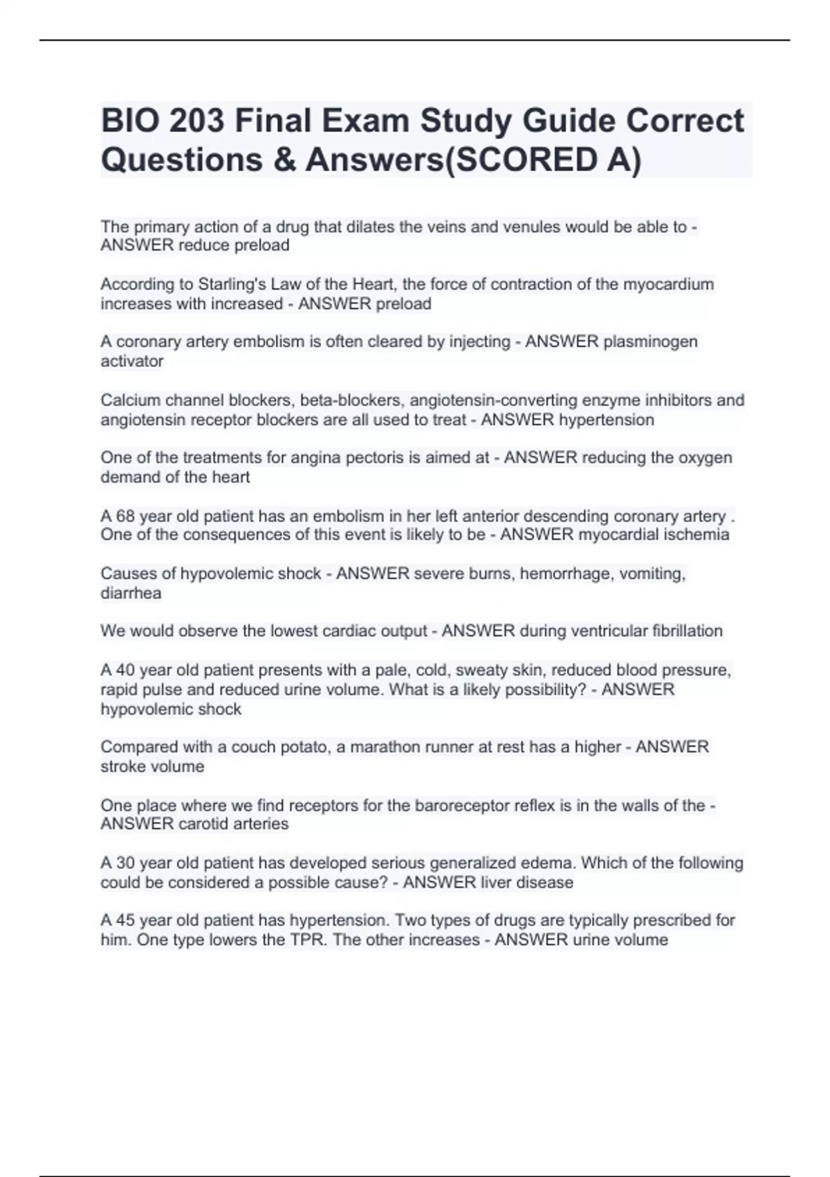 BIO 203 Final Exam Study Guide Correct QuesThe primary action of a drug that dilates the veins and venules would be able to - ANSWER reduce preload According to Starling's Law of the Heart, the force of contraction of the myocardium increases with increased - ANSWER preload A coronary artery embolism is often cleared by injecting - ANSWER plasminogen activator Calcium channel blockers, beta-blockers, angiotensin-converting enzyme inhibitors and angiotensin receptor blockers are all used to treat - ANSWER hypertension One of the treatments for angina pectoris is aimed at - ANSWER reducing the oxygen demand of the heart A 68 year old patient has an embolism in her left anterior descending coronary artery . One of the consequences of this event is likely to be - ANSWER myocardial ischemia Causes of hypovolemic shock - ANSWER severe burns, hemorrhage, vomiting, diarrhea We would observe the lowest cardiac output - ANSWER during ventricular fibrillation A 40 year old patient presents with a pale, cold, sweaty skin, reduced blood pressure, rapid pulse and reduced urine volume. What is a likely possibility? - ANSWER hypovolemic shock Compared with a couch potato, a marathon runner at rest has a higher - ANSWER stroke volume One place where we find receptors for the baroreceptor reflex is in the walls of the - ANSWER carotid arteries A 30 year old patient has developed serious generalized edema. Which of the following could be considered a possible cause? - ANSWER liver disease A tions & Answers(SCORED A)