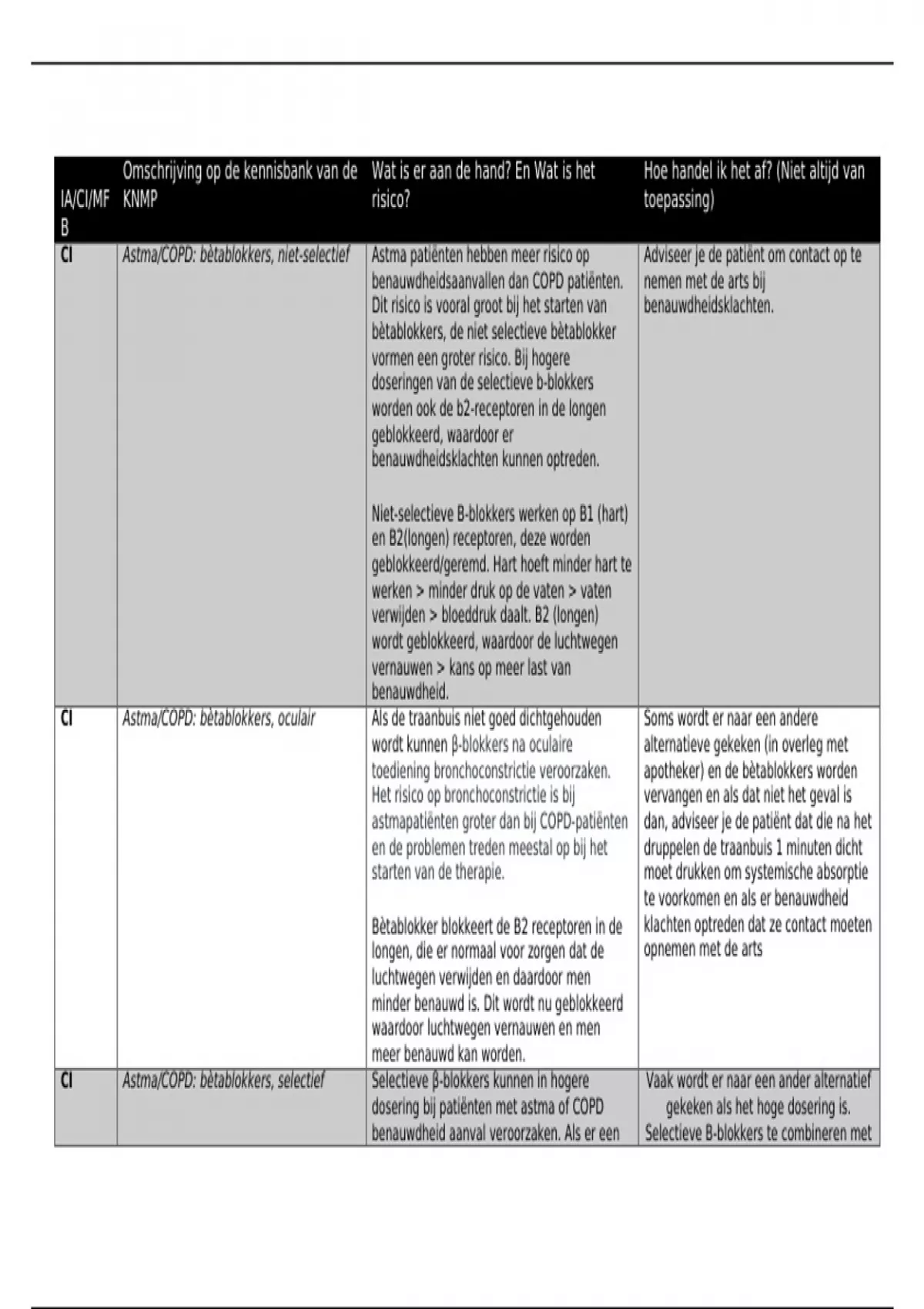 CI Astma/COPD: bètablokkers, niet-selectief Astma patiënten hebben meer risico op Adviseer je de patiënt om contact op te