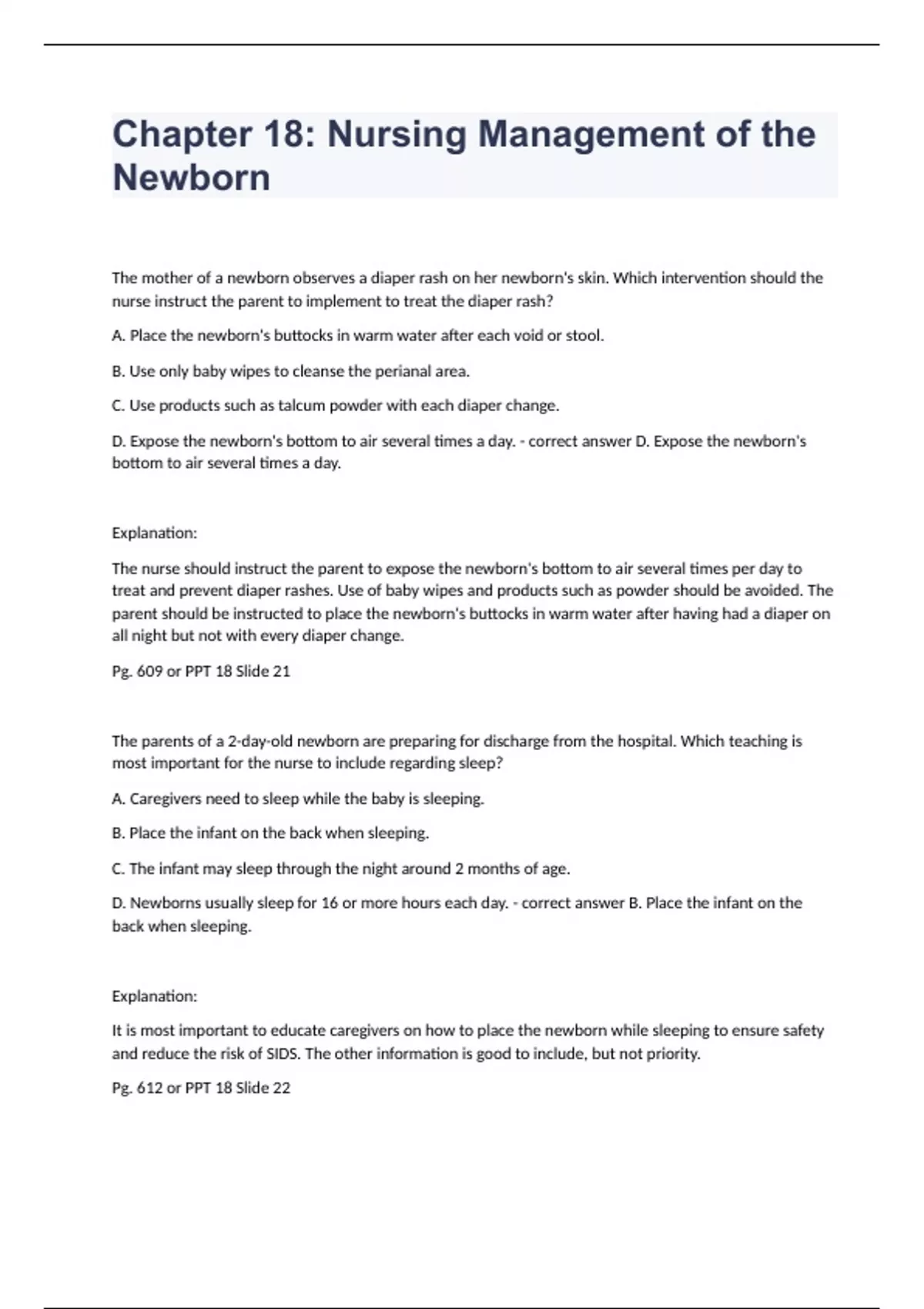 Chapter 18 Nursing Management Of The Newborn Final Exam Questions 2024. The mother of a newborn observes a diaper rash on her newborn's skin. Which intervention should the nurse instruct the parent to implement to treat the diaper rash? A. Place the newborn's buttocks in warm water after each void or stool. B. Use only baby wipes to cleanse the perianal area. C. Use products such as talcum powder with each diaper change. D. Expose the newborn's bottom to air several times a day. - correct answer D. Expose the newborn's bottom to air several times a day. Explanation: The nurse should instruct the parent to expose the newborn's bottom to air several times per day to treat and prevent diaper rashes. Use of baby wipes and products such as powder should be avoided. The parent should be instructed to place the newborn's buttocks in warm water after having had a diaper on all night but not with every diaper change. Pg. 609 or PPT 18 Slide 21 The parents of a 2-day-old newborn are preparing for discharge from the hospital. Which teaching is most important for the nurse to include regarding sleep? A. Caregivers need to sleep while the baby is sleeping. B. Place the infant on the back when sleeping. C. The infant may sleep through the night around 2 months of age. D. Newborns usually sleep for 16 or more hours each day. - correct answer B. Place the infant on the back when sleeping. Explanation: It is most important to educate caregivers on how to place the newborn while sleeping to ensure safety and reduce the risk of SIDS. The other information is good to include, but not priority. Pg. 612 or PPT 18 Slide 22 A nurse does an initial assessment on a newborn and notes a pulsation over the anterior fontanel (fontanelle) that corresponds with the newborn's heart rate. How would the nurse interpret this finding? A. If the fontanel (fontanelle) feels full, then this is normal. B. This is an abnormal finding and needs to be reported immediately. C. It is normal to feel pulsations that correlate with the newborn's heart rate over the anterior fontanel (fontanelle). D. This finding is normal if the pulsation can also be palpated in the posterior fontanel (fontanelle). - correct answer C. It is normal to feel pulsations that correlate with the newborn's heart rate over the anterior fontanel (fontanelle). Explanation: Feeling a pulsation over the fontanel (fontanelle) correlating to the newborn's heart rate is normal. The pulsation should not be felt in the posterior fontanel (fontanelle). The fontanel (fontanelle) should not be bulging under any circumstance in a newborn. Pg. 596