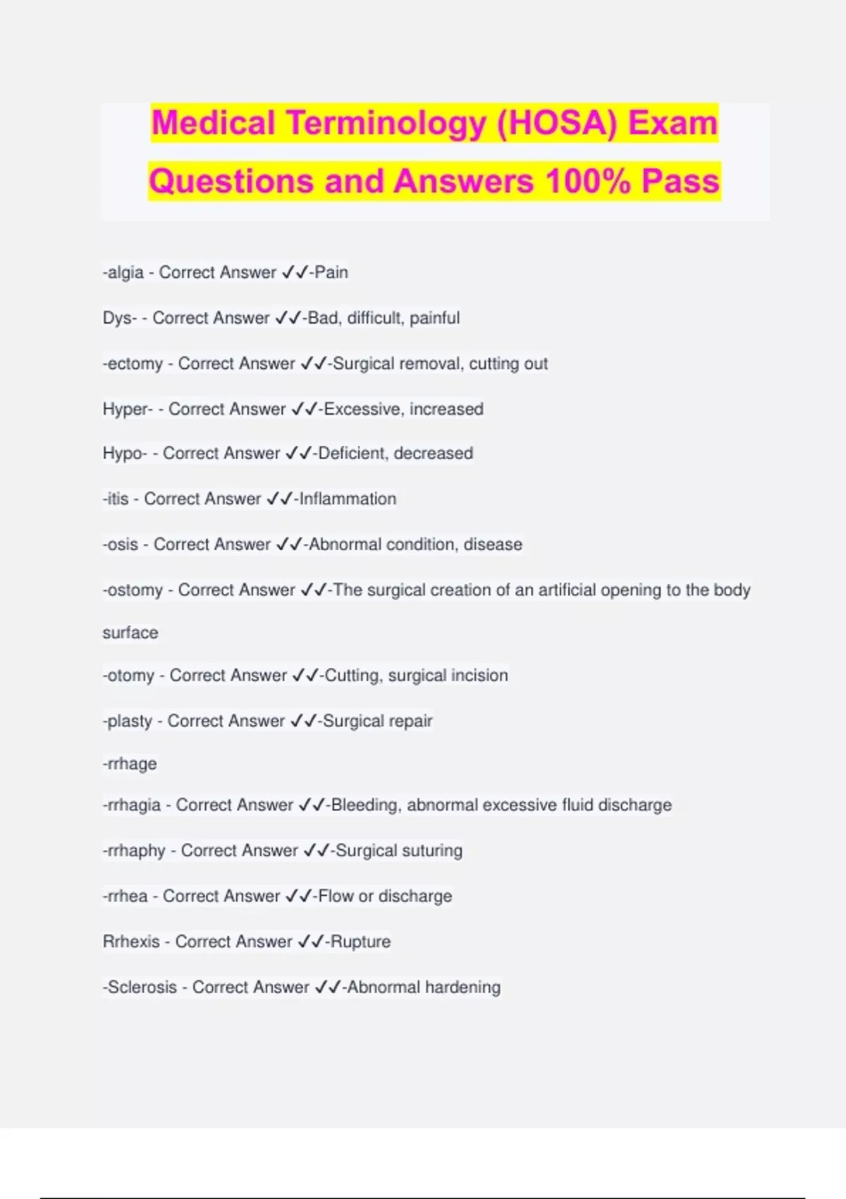 Medical Terminology (HOSA) Exam Questions and Answers 100% Pass -algia - Correct Answer ️️ -Pain Dys- - Correct Answer ️️ -Bad, difficult, painful -ectomy - Correct Answer ️️ -Surgical removal, cutting out Hyper- - Correct Answer ️️ -Excessive, increased Hypo- - Correct Answer ️️ -Deficient, decreased -itis - Correct Answer ️️ -Inflammation -osis - Correct Answer ️️ -Abnormal condition, disease -ostomy - Correct Answer ️️ -The surgical creation of an artificial opening to the body surface -otomy - Correct Answer ️️ -Cutting, surgical incision -plasty - Correct Answer ️️ -Surgical repair -rrhage -rrhagia - Correct Answer ️️ -Bleeding, abnormal excessive fluid discharge -rrhaphy - Correct Answer ️️ -Surgical suturing -rrhea - Correct Answer ️️ -Flow or discharge Rrhexis - Correct Answer ️️ -Rupture -Sclerosis - Correct Answer ️️ -Abnormal hardening Gastr/o - Correct Answer ️️ -Stomachc Myel/o - Correct Answer ️️ -Spinal cord Oset/o - Correct Answer ️️ -Bone My/o - Correct Answer ️️ -Muscular Neur/o - Correct Answer ️️ -Nerve Arthr/o - Correct Answer ️️ -Joint Enter/o - Correct Answer ️️ -Small intestine Crani - Correct Answer ️️ -Skull -um -a -e -us -y - Correct Answer ️️ -Noun ending Tonsill - Correct Answer ️️ -Tonsils Poli/o - Correct Answer ️️ -Grey Melan/o - Correct Answer ️️ -Black Leuk/o - Correct Answer ️️ -White Erythr/o - Correct Answer ️️ -Red Cyan/o - Correct Answer ️️ -Blue -Cyte - Correct Answer ️️ -Cell -ac -al -an -ar -ary -Eal -iCal -ial -ic -ine -ior -ory -ous -tic - Correct Answer ️️ -Pertaining to Cardi/o - Correct Answer ️️ -Heart -ago -esis -ia -iasis -ion -ism -osis - Correct Answer ️️ -Abnormal condition Path - Correct Answer ️️ -Diseases