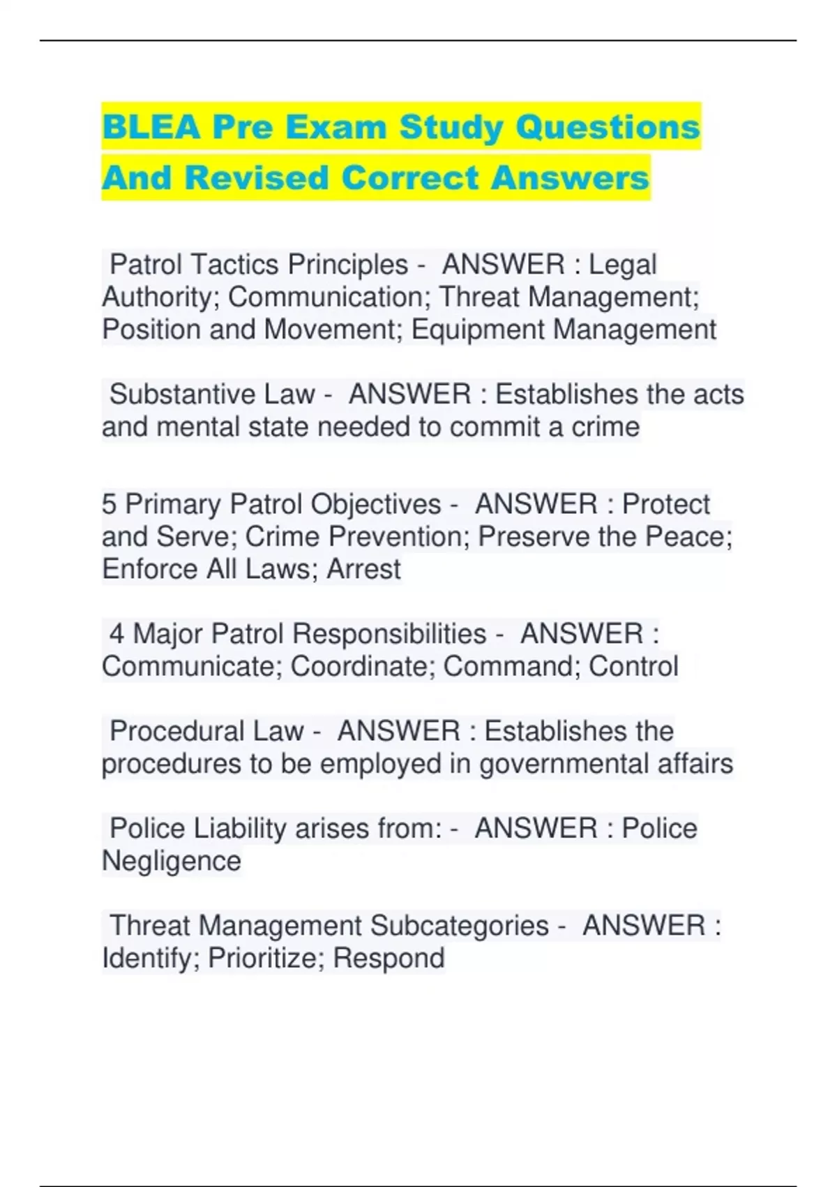 BLEA Pre Exam Study Questions And Revised Correct Answers Patrol Tactics Principles - ANSWER : Legal Authority; Communication; Threat Management; Position and Movement; Equipment Management Substantive Law - ANSWER : Establishes the acts and mental state needed to commit a crime 5 Primary Patrol Objectives - ANSWER : Protect and Serve; Crime Prevention; Preserve the Peace; Enforce All Laws; Arrest 4 Major Patrol Responsibilities - ANSWER : Communicate; Coordinate; Command; Control Procedural Law - ANSWER : Establishes the procedures to be employed in governmental affairs Police Liability arises from: - ANSWER : Police Negligence Threat Management Subcategories - ANSWER : Identify; Prioritize; Respond