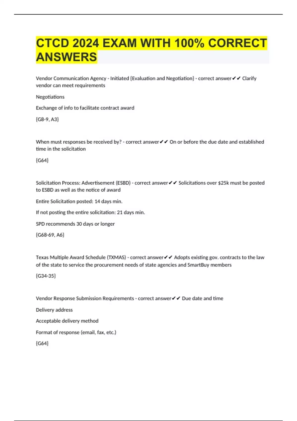 CTCD 2024 EXAM WITH 100% CORRECT ANSWERS Vendor Communication Agency - Initiated {Evaluation and Negotiation} - correct answer Clarify vendor can meet requirements Negotiations Exchange of info to facilitate contract award {G8-9, A3} When must responses be received by? - correct answer On or before the due date and established time in the solicitation {G64} Solicitation Process: Advertisement (ESBD) - correct answer Solicitations over $25k must be posted to ESBD as well as the notice of award Entire Solicitation posted: 14 days min. If not posting the entire solicitation: 21 days min. SPD recommends 30 days or longer {G68-69, A6} Texas Multiple Award Schedule (TXMAS) - correct answer Adopts existing gov. contracts to the law of the state to service the procurement needs of state agencies and SmartBuy members {G34-35} Vendor Response Submission Requirements - correct answer Due date and time Delivery address Acceptable delivery method Format of response (email, fax, etc.) {G64}