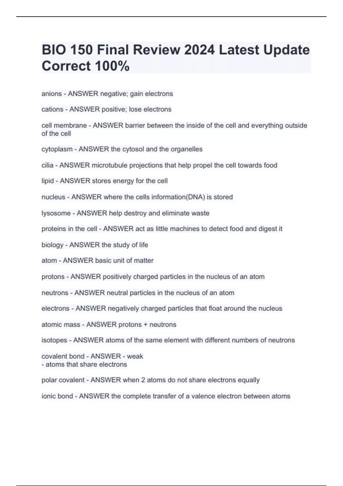 bio 150 final review 2024 latest update correct 10