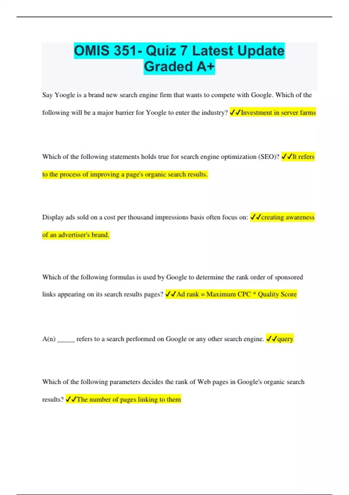 OMIS 351- Quiz 7 Latest Update Graded A+ Say Yoogle is a brand new search engine firm that wants to compete with Google. Which of the following will be a major barrier for Yoogle to enter the industry? Investment in server farms Which of the following statements holds true for search engine optimization (SEO)? It refers to the process of improving a page's organic search results. Display ads sold on a cost per thousand impressions basis often focus on: creating awareness of an advertiser's brand. Which of the following formulas is used by Google to determine the rank order of sponsored links appearing on its search results pages? Ad rank = Maximum CPC * Quality Score A(n) _____ refers to a search performed on Google or any other search engine. query Which of the following parameters decides the rank of Web pages in Google's organic search results? The number of pages linking to them _____ are third-party computers that pass traffic to and from specific addresses without revealing the address of the connected users. Proxy servers Which of the following is true of Google's discounting scheme for advertisers? Advertisers pay one cent more than the minimum needed to retain an ad's position on the page. The founder of AskTheB, Tim Carter, used _______ to make more ad revenue than when he was _____________? AdSense; syndicating to 30 newspapers. Why couldn't Dr. Downing use AdSense to host ads on ChuckD? Google claimed "Difficult site navigation"... too many password-protected links, etc. If the number of shares issued and the market capitalization of a firm are 50,000 and $2,500,000 respectively, the share price is _____. $50 The bulk of Google's revenue comes from _____. Advertising Which of the following factors contributes to an ad's quality score? Click through Rate If a firm's pages are not near the top of query results, customers may never discover its Web site. This has led to _____ becoming a critical function for many marketing organizations. search engine optimization Search engines use _____ to discover documents for indexing and retrieval. web-crawling spiders Which of the following statements holds true for the term spider? It refers to software that traverses available Web links in an attempt to perform a given task. Which of the following statements holds true for the term server farm? It refers to a massive network of computer servers running software to coordinate their collective use. The Web site displayed when a user clicks on an ad is called the: landing page. Why is linking ads to search results considered a brilliant move? User's search term indicates an overt interest in a given topic. If a web site owner pays about 60 cents per click to advertise on Google, what would be the best way listed below for a competitor to hurt him (assuming that competitor was willing to engage in unethical practices)? Get allies (of the competitor) to