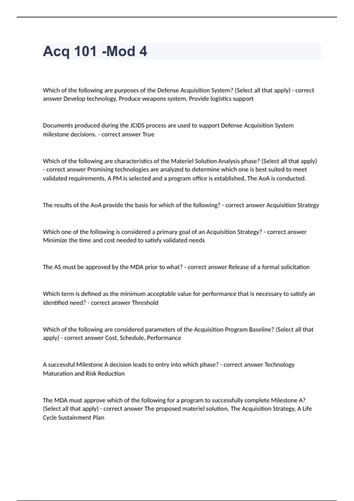 ACQ 101 -Mod 4 Final Review Exam Guide 2024. Which of the following are purposes of the Defense Acquisition System? (Select all that apply) - correct answer Develop technology, Produce weapons system, Provide logistics support Documents produced during the JCIDS process are used to support Defense Acquisition System milestone decisions. - correct answer True Which of the following are characteristics of the Materiel Solution Analysis phase? (Select all that apply) - correct answer Promising technologies are analyzed to determine which one is best suited to meet validated requirements, A PM is selected and a program office is established, The AoA is conducted. The results of the AoA provide the basis for which of the following? - correct answer Acquisition Strategy Which one of the following is considered a primary goal of an Acquisition Strategy? - correct answer Minimize the time and cost needed to satisfy validated needs The AS must be approved by the MDA prior to what? - correct answer Release of a formal solicitation Which term is defined as the minimum acceptable value for performance that is necessary to satisfy an identified need? - correct answer Threshold Which of the following are considered parameters of the Acquisition Program Baseline? (Select all that apply) - correct answer Cost, Schedule, Performance A successful Milestone A decision leads to entry into which phase? - correct answer Technology Maturation and Risk Reduction The MDA must approve which of the following for a program to successfully complete Milestone A? (Select all that apply) - correct answer The proposed materiel solution, The Acquisition Strategy, A Life Cycle Sustainment Plan