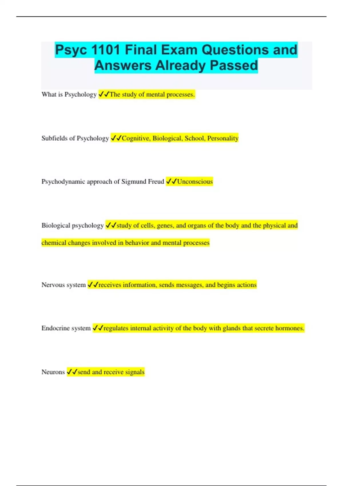 Psyc 1101 Final Exam Questions and Answers Already Passed What is Psychology The study of mental processes. Subfields of Psychology Cognitive, Biological, School, Personality Psychodynamic approach of Sigmund Freud Unconscious Biological psychology study of cells, genes, and organs of the body and the physical and chemical changes involved in behavior and mental processes Nervous system receives information, sends messages, and begins actions Endocrine system regulates internal activity of the body with glands that secrete hormones. Neurons send and receive signals Glial cells "glue" these cells hold neurons together. But they also guide neuron's growth, maintain a stable chemical environment, provide energy, help restore damage, and help respond to signals from neurons. Axon a cell fiber that carries signals away from the cell body. (most neurons only have one) Dendrite a cell fiber that receives signals from other neurons and carries information toward the neurons cell body. (most neurons have many dendrites) Action potentials are electrochemical pulses that shoot down the neuron's axon. * "all or none" it either fires at full strength or not at all. *Speed depends on thickness of axon and myelin(white fatty substance that speeds up ) How do dendrites receive messages? bag-like vesicles release stored chemicals called Neurotransmitters into space between two neurons Synapse space between neurons Neurotransmitters chemical that floats across synapse to bind with receptors, proteins on a dendrite or receiving neuron. Central Nervous System (CNS) Consists of the brain and spinal cord (protected by bone). is the CEO of the nervous system- receives info, processes it and decides what actions should result. Peripheral Nervous System extends throughout the body and relays info. to and from the brain. Somatic Nervous System carries signals between the senses and CNS, and between the CNS and skeletal muscles. sensory neurons bring info to the brain motor neurons send info from brain to muscles Autonomic Nervous System carries messages between the CNS and the heart, lungs, and other organs and glands.