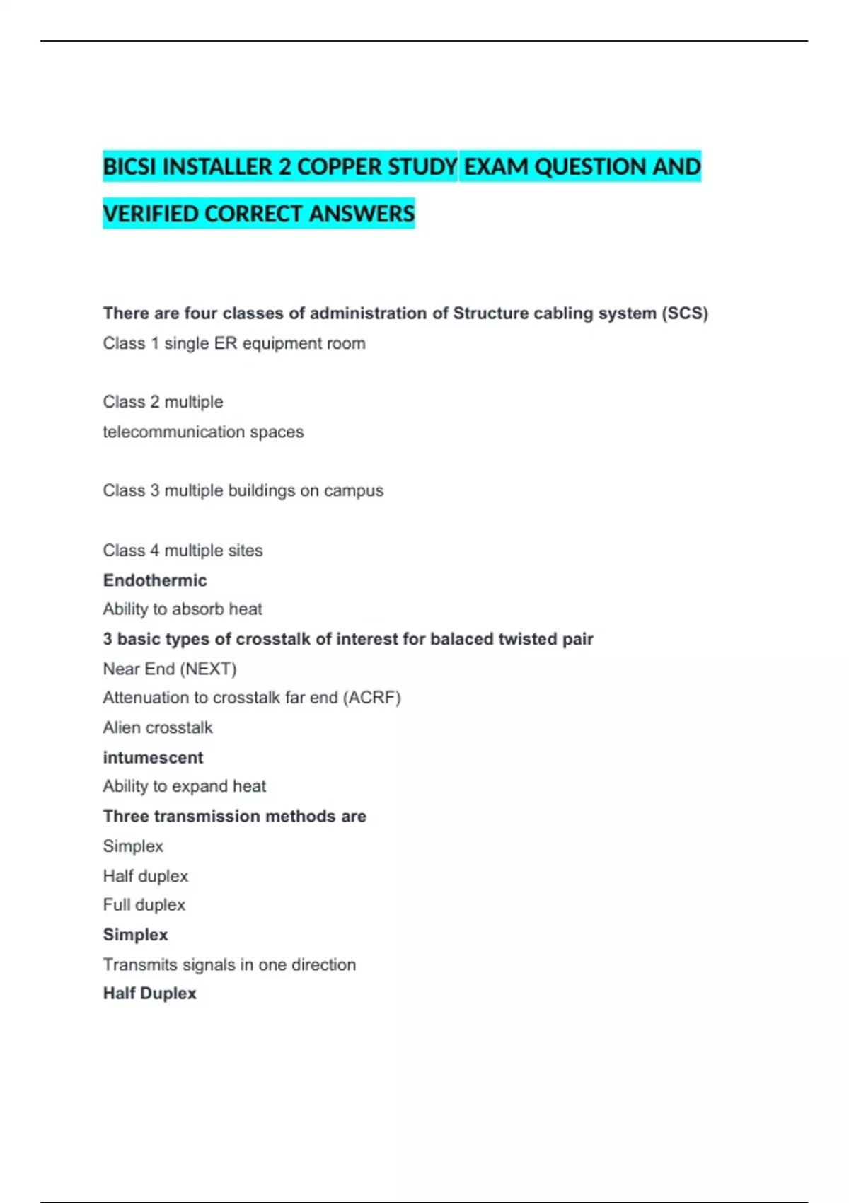 BICSI INSTALLER 2 COPPER STUDY EXAM QUESTION AND VERIFIED CORRECT ANSWERS There are four classes of administration of Structure cabling system (SCS) Class 1 single ER equipment room Class 2 multiple telecommunication spaces Class 3 multiple buildings on campus Class 4 multiple sites Endothermic Ability to absorb heat 3 basic types of crosstalk of interest for balaced twisted pair Near End (NEXT) Attenuation to crosstalk far end (ACRF) Alien crosstalk intumescent Ability to expand heat Three transmission methods are Simplex Half duplex Full duplex Simplex Transmits signals in one direction Half Duplex