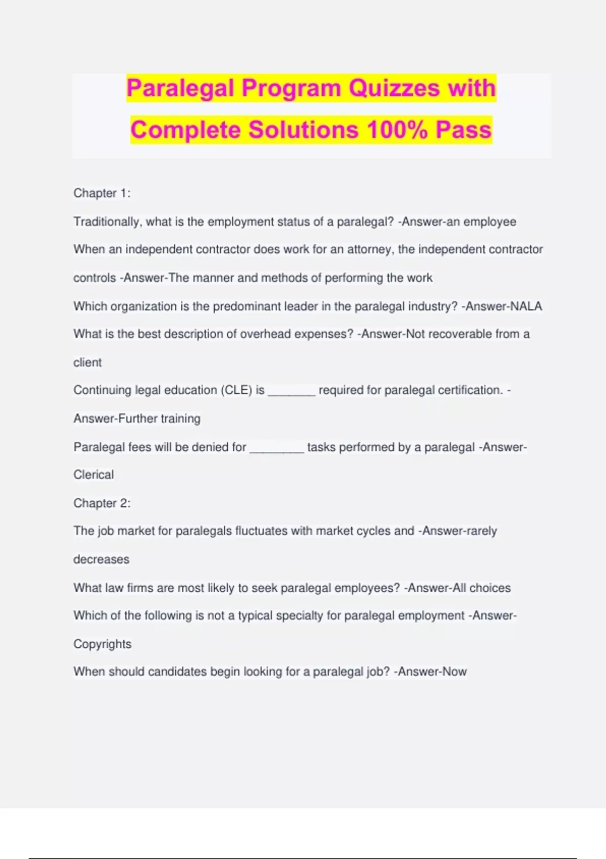 Paralegal Program Quizzes with Complete Solutions 100% Pass Chapter 1: Traditionally, what is the employment status of a paralegal? -Answer-an employee When an independent contractor does work for an attorney, the independent contractor controls -Answer-The manner and methods of performing the work Which organization is the predominant leader in the paralegal industry? -Answer-NALA What is the best description of overhead expenses? -Answer-Not recoverable from a client Continuing legal education (CLE) is _______ required for paralegal certification. - Answer-Further training Paralegal fees will be denied for ________ tasks performed by a paralegal -Answer- Clerical Chapter 2: The job market for paralegals fluctuates with market cycles and -Answer-rarely decreases What law firms are most likely to seek paralegal employees? -Answer-All choices Which of the following is not a typical specialty for paralegal employment -Answer- Copyrights When should candidates begin looking for a paralegal job? -Answer-Now A resume that lists your work history beginning with the most recent position is a - Answer-Chronological resume Chapter 3: Which of the following is a factor affecting job satisfaction? -Answer-All choices - salary - being recognized as a professional - clear lines of authority Which of the following are common problems that lead to miscommunication regarding an assigned task? -Answer-All choices - being embarrassed to ask for clarification - being distracted by "multi tasking" - personality issues One of the best ways to deal with miscommunication in the workplace environment is - Answer-Initiate change and attempt to resolve conflicts by managing your anger and valuing the opinions of others One of the biggest hurdles for most new paralegals to overcome in the evaluation process is -Answer-Accepting criticism without becoming defensive An employer must actively combat sexual harassment by -Answer-All choices - distributing a written policy in the office - informing employees of their rights - investigating all accusations A characteristic important in gaining promotions and advancing your career is -Answer- Networking within the paralegal community Chapter 4: Which of the following would be considered the appropriate legal information under the role of a paralegal? -Answer-Informing a client that a plea has been received from the District Attorney's Office. Which of the following would be considered providing legal information? -Answer-All choices - Informing the client of the deadline to respond to a lawsuit - Telling a client about a website with legal explanations that could help a client decide on a particular issue -Defining the "statute of frauds" for a client A process by which a non-governmental agency or association grants recognition to an individual who has met certain predetermined qualifications spe