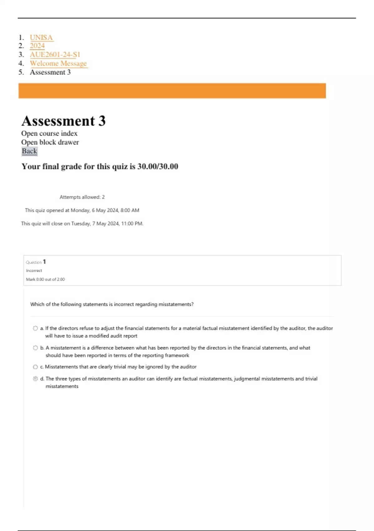 d. The three types of misstatements an auditor can identify are factual misstatements, judgmental misstatements and trivial