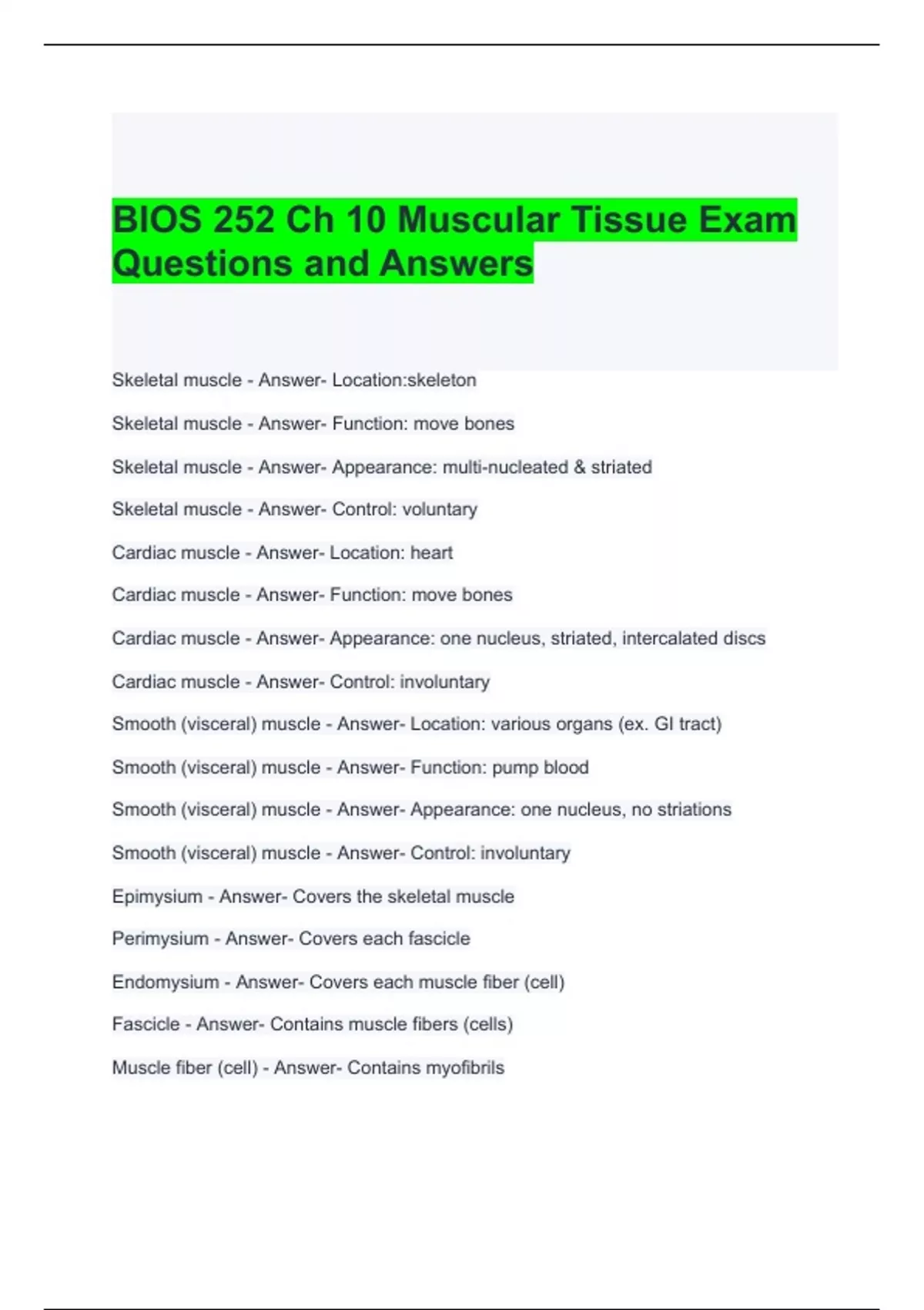 BIOS 252 Ch 10 Muscular Tissue Exam Questions and Answers