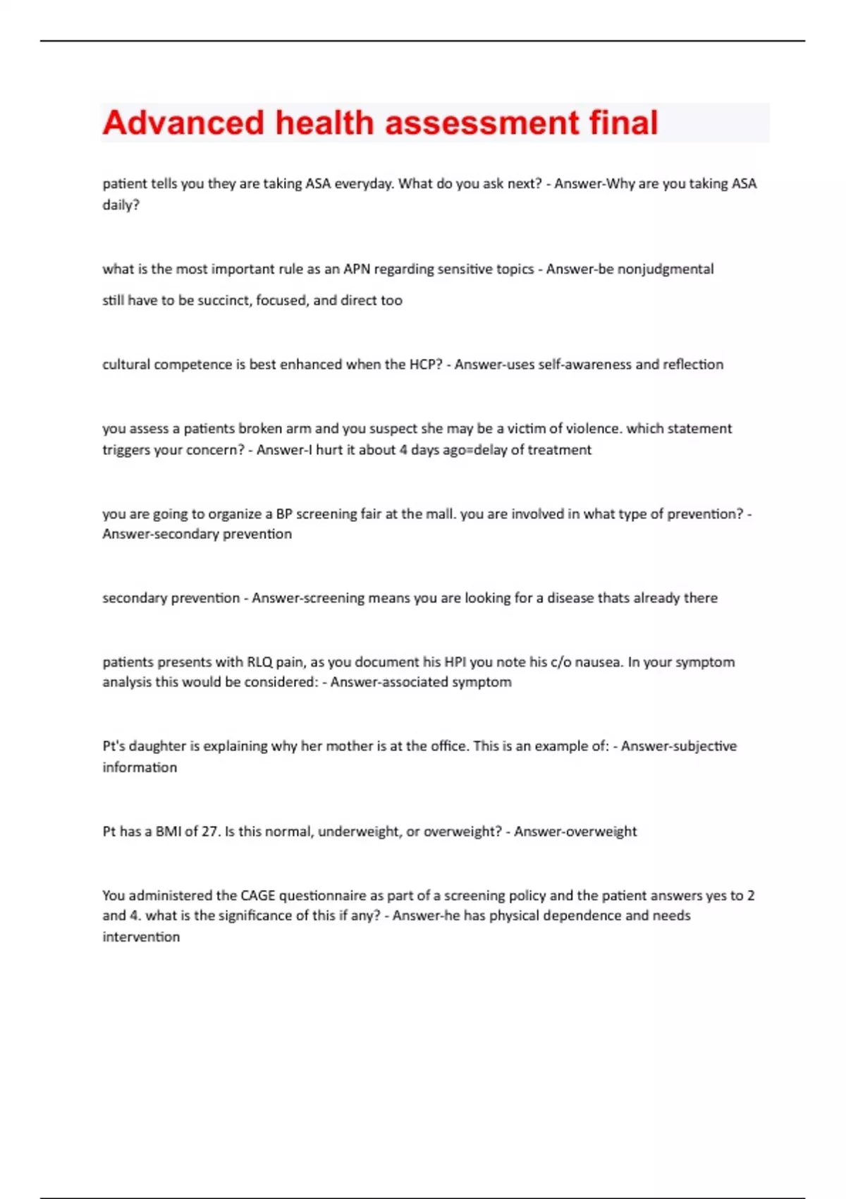 patient tells you they are taking ASA everyday. What do you ask next? - Answer-Why are you taking ASA daily? what is the most important rule as an APN regarding sensitive topics - Answer-be nonjudgmental still have to be succinct, focused, and direct too cultural competence is best enhanced when the HCP? - Answer-uses self-awareness and reflection you assess a patients broken arm and you suspect she may be a victim of violence. which statement triggers your concern? - Answer-I hurt it about 4 days ago=delay of treatment you are going to organize a BP screening fair at the mall. you are involved in what type of prevention? - Answer-secondary prevention secondary prevention - Answer-screening means you are looking for a disease thats already there patients presents with RLQ pain, as you document his HPI you note his c/o nausea. In your symptom analysis this would be considered: - Answer-associated symptom Pt's daughter is explaining why her mother is at the office. This is an example of: - Answer-subjective information Pt has a BMI of 27. Is this normal, underweight, or overweight? - Answer-overweight You administered the CAGE questionnaire as part of a screening policy and the patient answers yes to 2 and 4. what is the significance of this if any? - Answer-he has physical dependence and needs interventionwhat does question 4 on the CAGE questionnaire ask? what is the significance of it? - Answer-do they need an eye opener? it indicates physical dependence you are meeting for the first time a 14 y/o female patient. you would want to include the what in her exam? - Answer-HEADS & RAFFT what does HEADS & RAFFT assess - Answer-behavior of the teenager patient scores a 29 on the mini-mental exam. what do you document this as? - Answer-a normal finding what are the components of the adult health history? - Answer-1. identifying data 2. history of present illness 3. review of systems NOT physical exam what does the CAGE questionnaire look for - Answer-alcoholism coronary artery disease risk factors (4) - Answer-1. smoking 2. HTN 3. family history 4. age