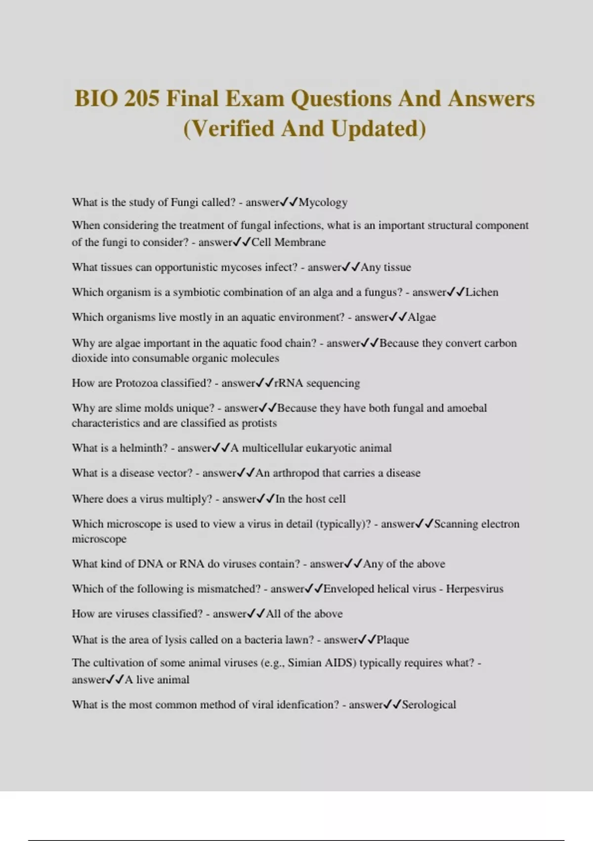 BIO 205 Final Exam Questions And Answers (Verified And Updated) What is the study of Fungi called? - answerMycology When considering the treatment of fungal infections, what is an important structural component of the fungi to consider? - answerCell Membrane What tissues can opportunistic mycoses infect? - answerAny tissue Which organism is a symbiotic combination of an alga and a fungus? - answerLichen Which organisms live mostly in an aquatic environment? - answerAlgae Why are algae important in the aquatic food chain? - answerBecause they convert carbon dioxide into consumable organic molecules How are Protozoa classified? - answerrRNA sequencing Why are slime molds unique? - answerBecause they have both fungal and amoebal characteristics and are classified as protists What is a helminth? - answerA multicellular eukaryotic animal What is a disease vector? - answerAn arthropod that carries a disease Where does a virus multiply? - answerIn the host cell Which microscope is used to view a virus in detail (typically)? - answerScanning electron microscope What kind of DNA or RNA do viruses contain? - answerAny of the above Which of the following is mismatched? - answerEnveloped helical virus - Herpesvirus How are viruses classified? - answerAll of the above What is the area of lysis called on a bacteria lawn? - answerPlaque The cultivation of some animal viruses (e.g., Simian AIDS) typically requires what? - answerA live animal What is the most common method of viral idenfication? - answerSerological