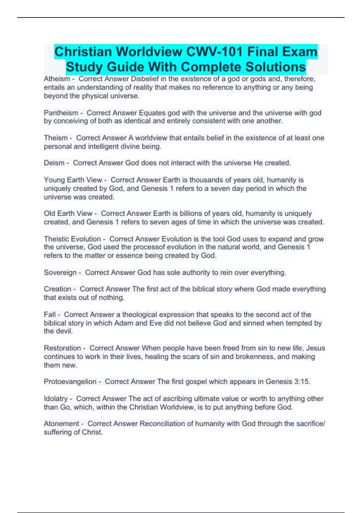 Christian Worldview CWV-101 Final Exam Study Guide With Complete Solutions Atheism - Correct Answer Disbelief in the existence of a god or gods and, therefore, entails an understanding of reality that makes no reference to anything or any being beyond the physical universe. Pantheism - Correct Answer Equates god with the universe and the universe with god by conceiving of both as identical and entirely consistent with one another. Theism - Correct Answer A worldview that entails belief in the existence of at least one personal and intelligent divine being. Deism - Correct Answer God does not interact with the universe He created. Young Earth View - Correct Answer Earth is thousands of years old, humanity is uniquely created by God, and Genesis 1 refers to a seven day period in which the universe was created. Old Earth View - Correct Answer Earth is billions of years old, humanity is uniquely created, and Genesis 1 refers to seven ages of time in which the universe was created. Theistic Evolution - Correct Answer Evolution is the tool God uses to expand and grow the universe, God used the processof evolution in the natural world, and Genesis 1 refers to the matter or essence being created by God. Sovereign - Correct Answer God has sole authority to rein over everything. Creation - Correct Answer The first act of the biblical story where God made everything that exists out of nothing. Fall - Correct Answer a theological expression that speaks to the second act of the biblical story in which Adam and Eve did not believe God and sinned when tempted by the devil. Restoration - Correct Answer When people have been freed from sin to new life, Jesus continues to work in their lives, healing the scars of sin and brokenness, and making them new. Protoevangelion - Correct Answer The first gospel which appears in Genesis 3:15. Idolatry - Correct Answer The act of ascribing ultimate value or worth to anything other than Go, which, within the Christian Worldview, is to put anything before God. Atonement - Correct Answer Reconciliation of humanity with God through the sacrifice/ suffering of Christ.