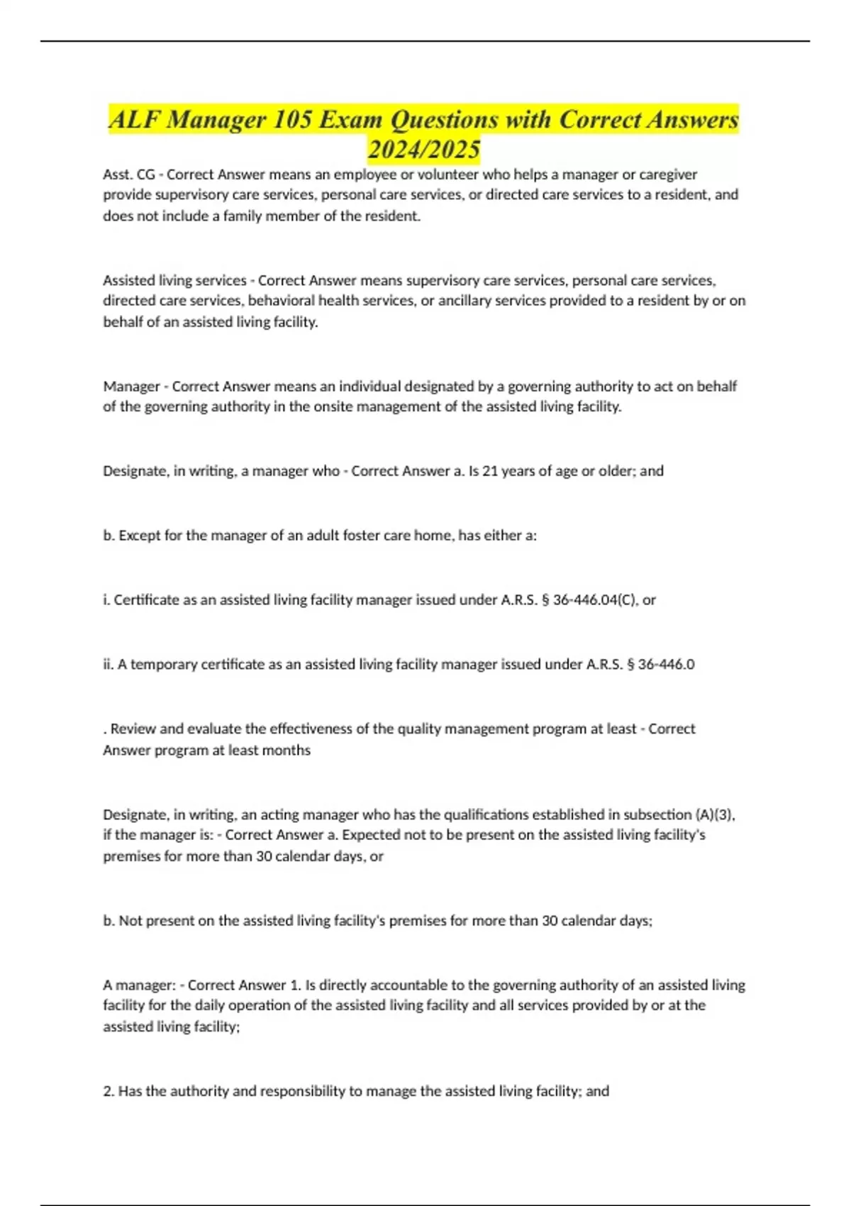 ALF Manager 105 Exam Questions with Correct Answers 2024/2025 Asst. CG - Correct Answer means an employee or volunteer who helps a manager or caregiver provide supervisory care services, personal care services, or directed care services to a resident, and does not include a family member of the resident. Assisted living services - Correct Answer means supervisory care services, personal care services, directed care services, behavioral health services, or ancillary services provided to a resident by or on behalf of an assisted living facility. Manager - Correct Answer means an individual designated by a governing authority to act on behalf of the governing authority in the onsite management of the assisted living facility. Designate, in writing, a manager who - Correct Answer a. Is 21 years of age or older; and b. Except for the manager of an adult foster care home, has either a: i. Certificate as an assisted living facility manager issued under A.R.S. § 36-446.04(C), or ii. A temporary certificate as an assisted living facility manager issued under A.R.S. § 36-446.0 . Review and evaluate the effectiveness of the quality management program at least - Correct Answer program at least months Designate, in writing, an acting manager who has the qualifications established in subsection (A)(3), if the manager is: - Correct Answer a. Expected not to be present on the assisted living facility's premises for more than 30 calendar days, or b. Not present on the assisted living facility's premises for more than 30 calendar days; A manager: - Correct Answer 1. Is directly accountable to the governing authority of an assisted living facility for the daily operation of the assisted living facility and all services provided by or at the assisted living facility; 2. Has the auth