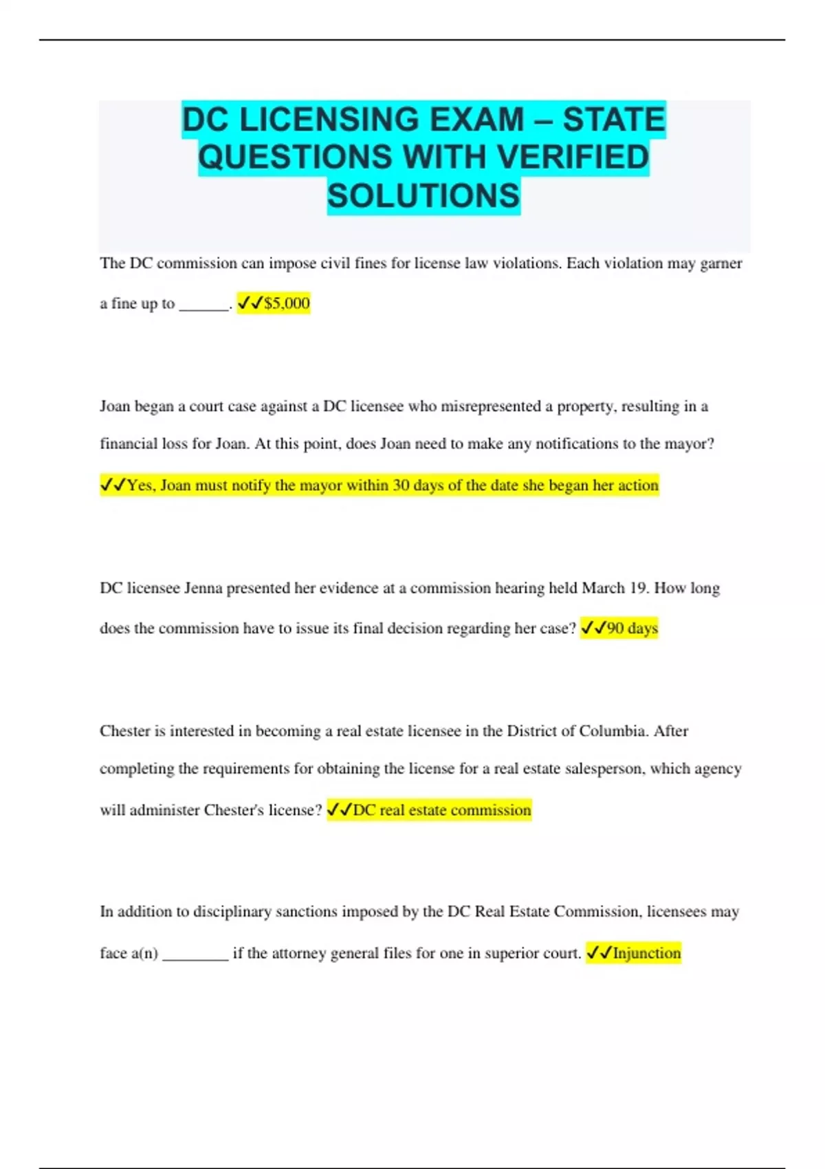 DC LICENSING EXAM – STATE QUESTIONS WITH VERIFIED SOLUTIONS
